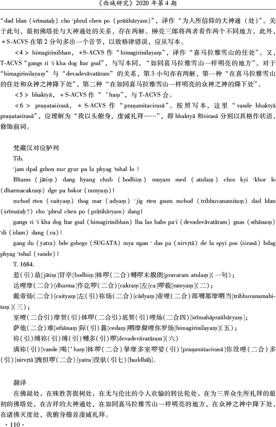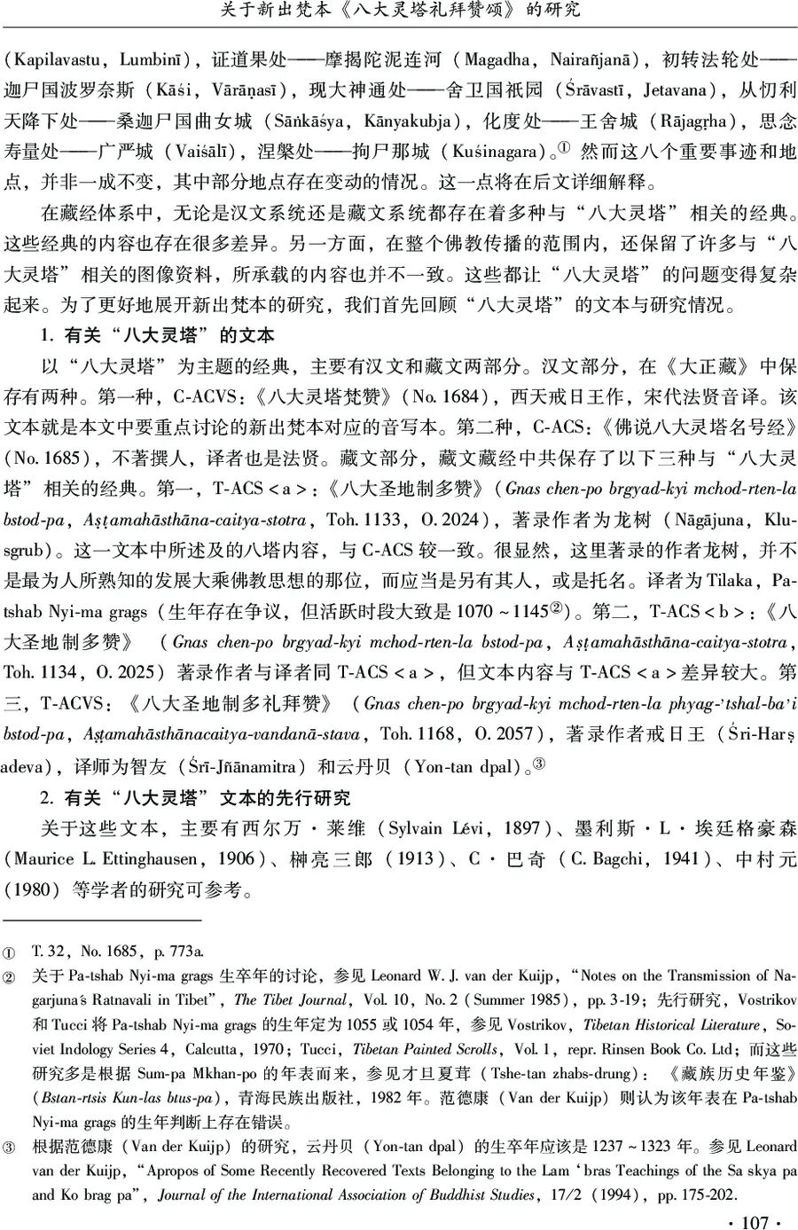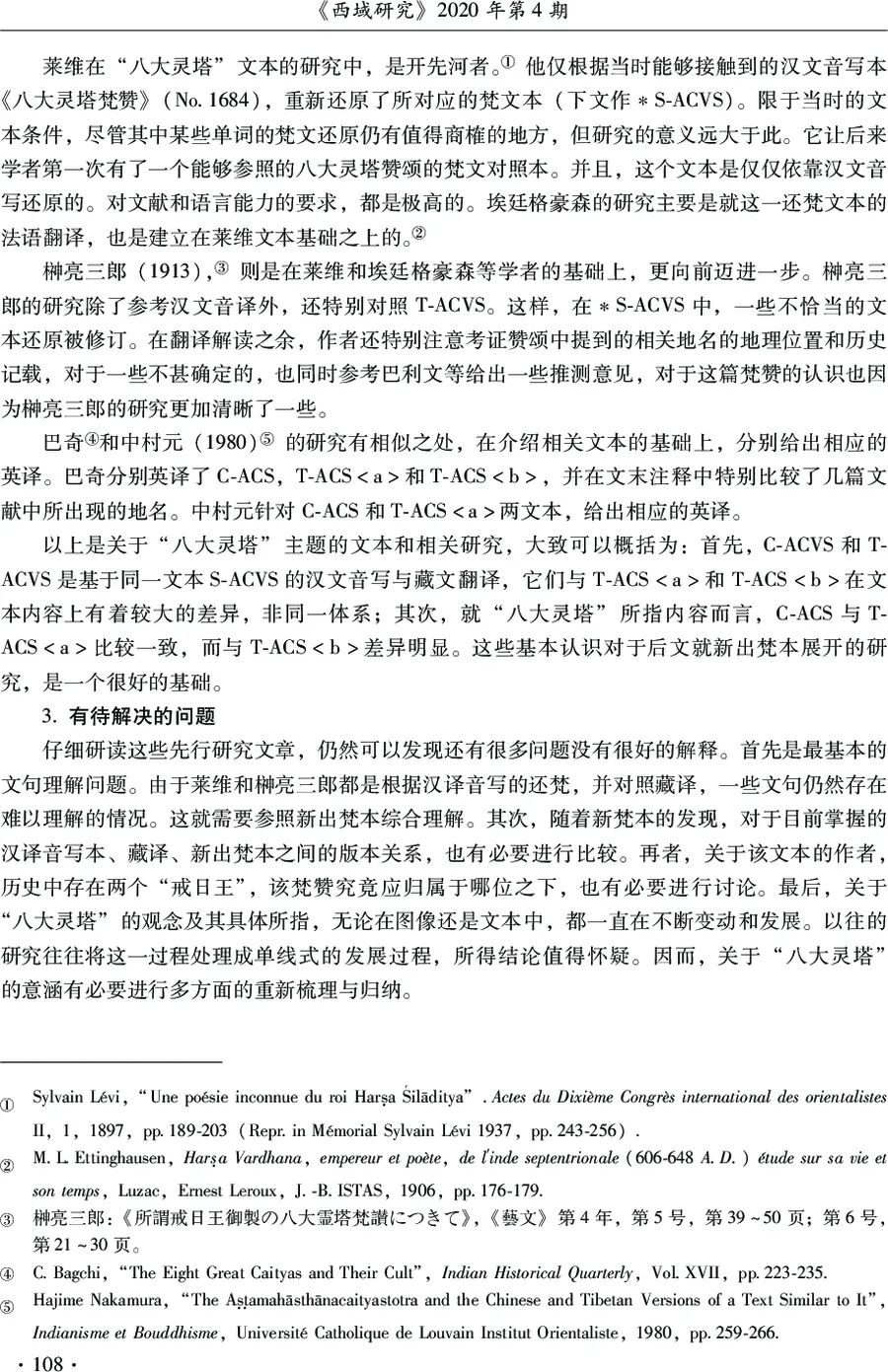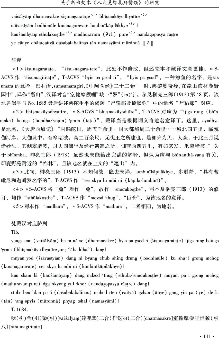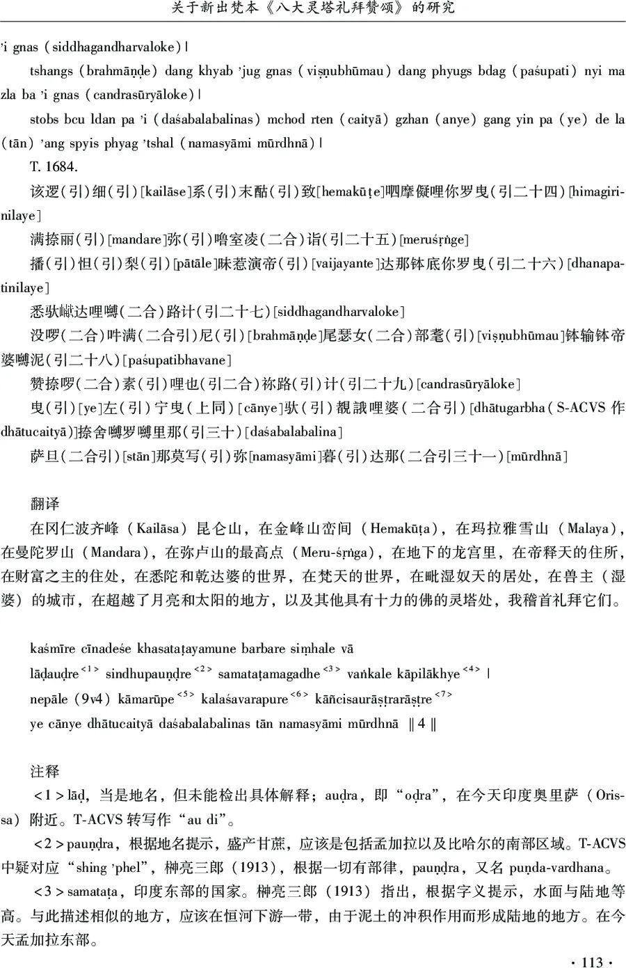 莱维在“八大灵塔”文本的研究中,是开先河者。[6]他仅根据当时能够接触到的汉文音写本《八大灵塔梵赞》(No.1684),重新还原了所对应的梵文本(下文作*S-ACVS)。限于当时的文本条件,尽管其中某些单词的梵文还原仍有值得商榷的地方,但研究的意义远大于此。它让后来学者第一次有了一个能够参照的八大灵塔赞颂的梵文对照本。并且,这个文本是仅仅依靠汉文音写还原的。对文献和语言能力的要求,都是极高的。埃廷格豪森的研究主要是就这一还梵文本的法语翻译,也是建立在莱维文本基础之上的。[7]