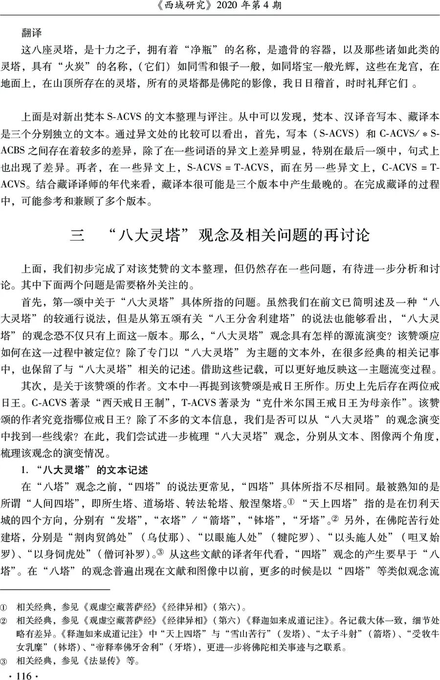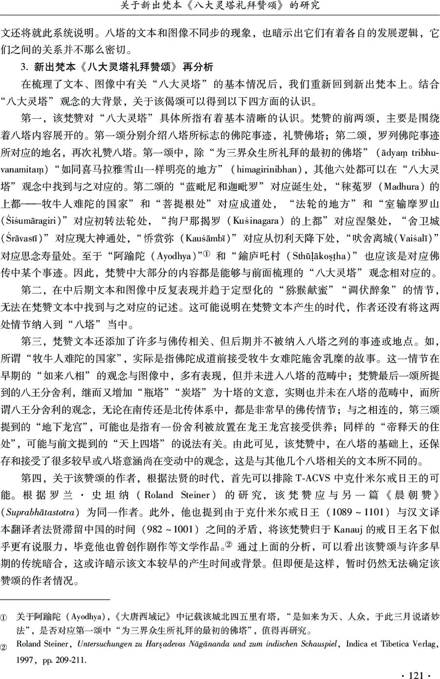 仔细研读这些先行研究文章,仍然可以发现还有很多问题没有很好的解释。首先是最基本的文句理解问题。由于莱维和榊亮三郎都是根据汉译音写的还梵,并对照藏译,一些文句仍然存在难以理解的情况。这就需要参照新出梵本综合理解。其次,随着新梵本的发现,对于目前掌握的汉译音写本、藏译、新出梵本之间的版本关系,也有必要进行比较。再者,关于该文本的作者,历史中存在两个“戒日王”,该梵赞究竟应归属于哪位之下,也有必要进行讨论。最后,关于“八大灵塔”的观念及其具体所指,无论在图像还是文本中,都一直在不断变动和发展。以往的研究往往将这一过程处理成单线式的发展过程,所得结论值得怀疑。因而,关于“八大灵塔”的意涵有必要进行多方面的重新梳理与归纳。