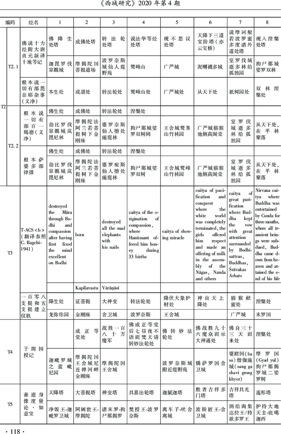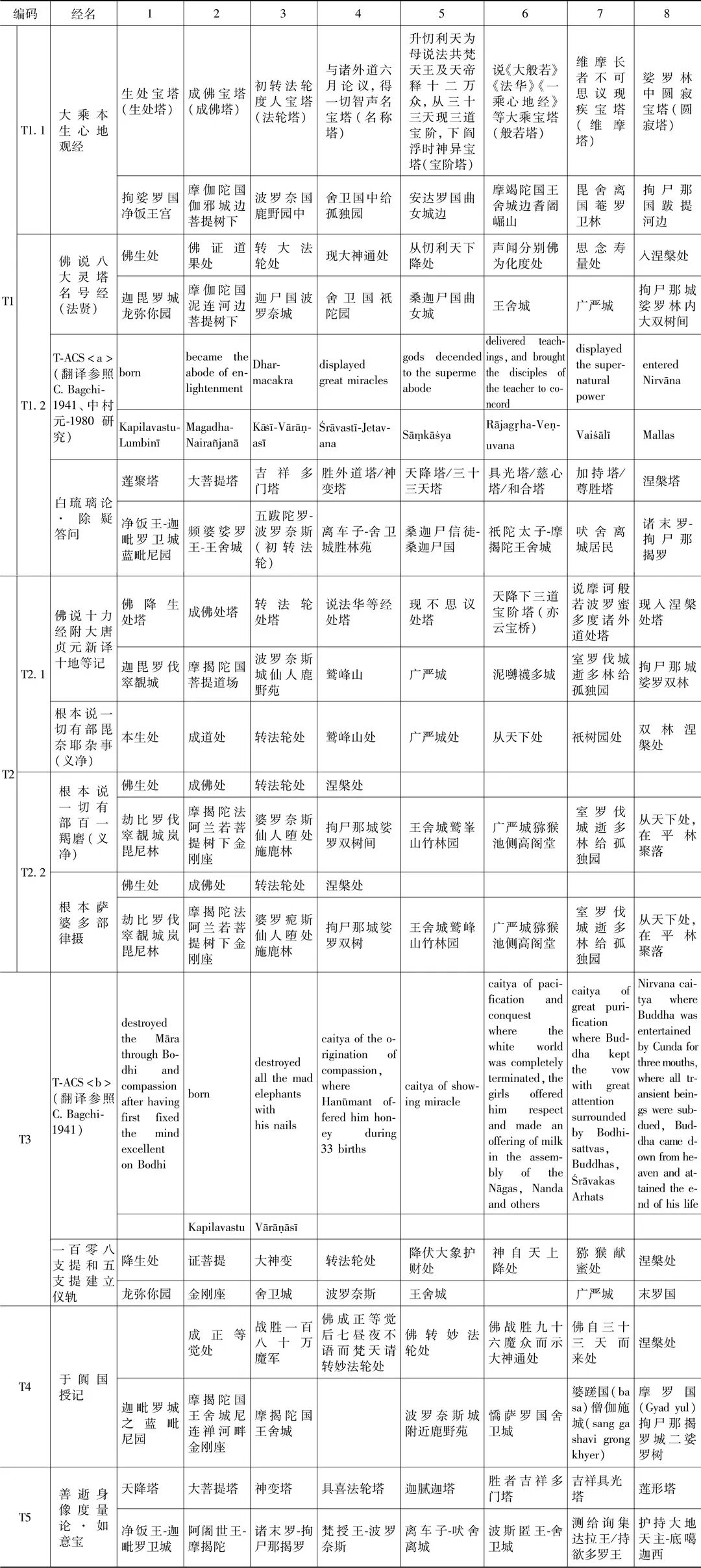 T1:该组地名大致相同,又根据佛陀事迹的细节差别,可以分成以下两个小组:T1.1《大乘本生心地观经》,其事迹内容记载稍有不同;T1.2《佛说八大灵塔名号经》《白琉璃论·除疑答问》和T-ACS<a>。