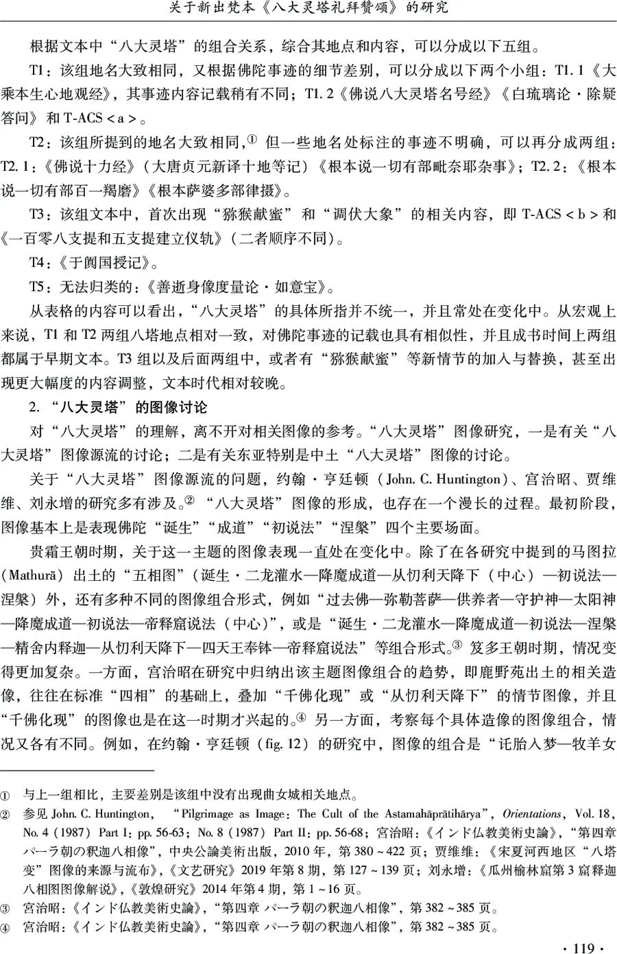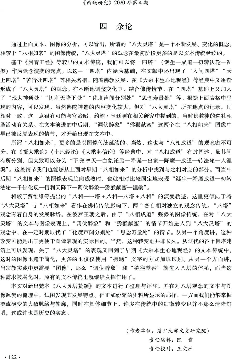 本文对新出梵本《八大灵塔赞颂》的文本进行了整理与评注,并在对八塔观念的文本与图像源流的梳理中,试图发现其发展特点。但正如纷繁的史料所显示的那样,一方面我们能够掌握源流演变的大致脉络与轮廓,同时在具体细节上,许多在传统中的细微转变也并不那么清晰鲜明,这或许也是历史的实态。