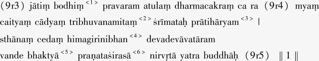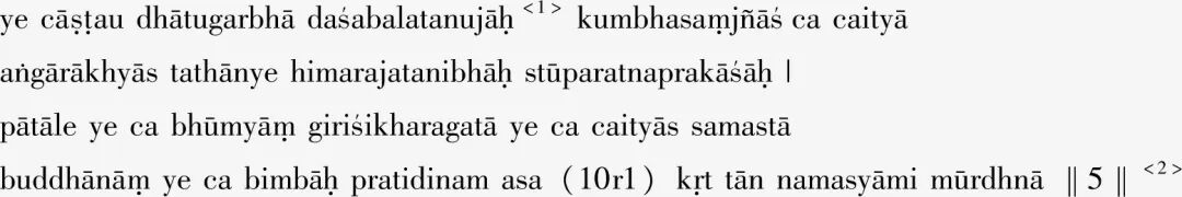 本文所讨论的新出写本来自西藏自治区。根据松田和信研究,该新出梵本与另外25种韵文为主的短篇作品合订为一部,该部写本共62叶(31.6cm×5cm),字体应是12~13世纪尼泊尔系婆罗米字体,每叶5行(见下图)。本文所讨论的《八大灵塔礼拜赞颂》,文本起止9r3~10r1。[11]经过梵本编辑及与汉字音写本、藏文译本的对照,可知该梵本由Mandākrāntā和Sragdharā两种格律写就,共5颂。