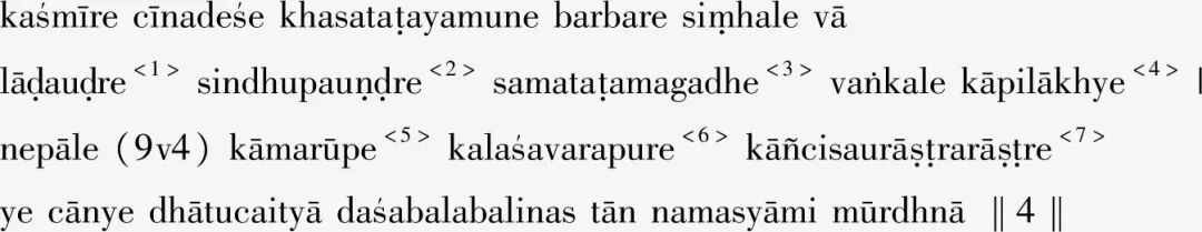在迦湿弥罗国(Kaśmīra),在中国(Cīna),在佉沙的山坡(Khasa-taṭa)和阎牟那(Yamuna)流域,在野蛮者的国度(Barbara),在锡兰岛(Siṃhala),在罗浓(Lāḍ)和乌荼罗(Auḍra),在印度河流域(Sindhu)和褒捺丽(Pauṇḍra),在三摩怛吒(Samataṭa)和摩揭陀(Magadha),在末朅梨(Vaṅkala),在具有迦毗罗(Kāpila)名字的地方,在尼泊尔(Nepāla),在迦摩缕波(Kāmarūpa),在割罗舍(Kalaśa)的上都,在从香至(Kāñci)至苏剌佗(Saurāṣṭra)的国度,以及其他具有十力的佛的灵塔处,我稽首礼拜它们。