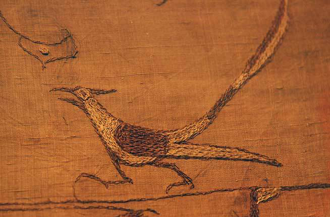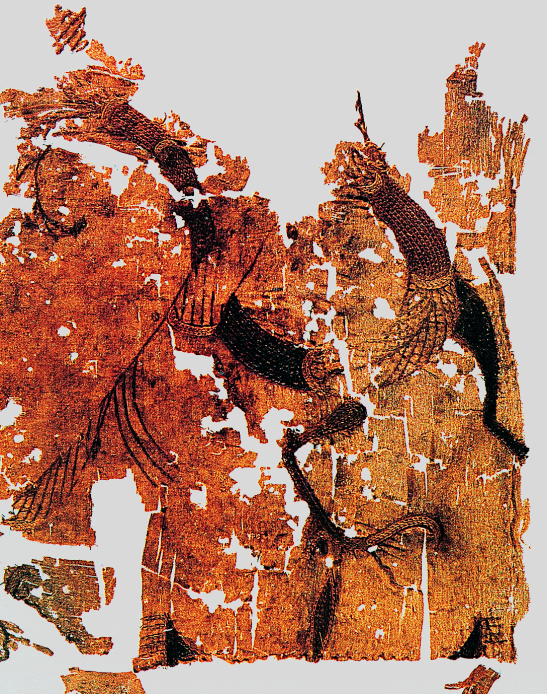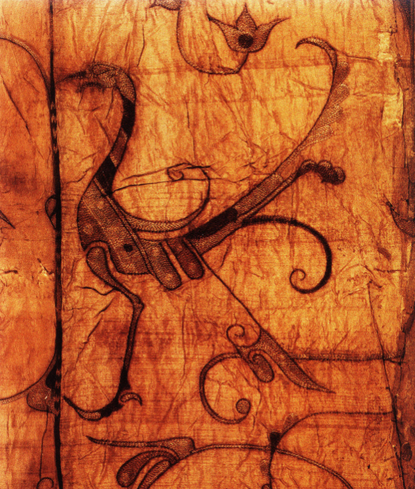 1976年,新疆文物考古研究所在阿拉沟发掘的一座塞人贵族墓冢中,出土了大量漆器和楚人巫风的凤鸟纹刺绣等,从刺绣凤鸟造型来看,与楚地特别是湖北荆州马山楚墓出土的刺绣十分相像。在俄罗斯境内巴泽雷克墓葬中也出土了大量极具楚文化线条特色的丝织品遗物,与阿拉沟出土凤鸟纹饰极具相似。三处墓葬时间,均为战国中晚期,其所采用的织法都是中国历史上传统的锁绣法。
