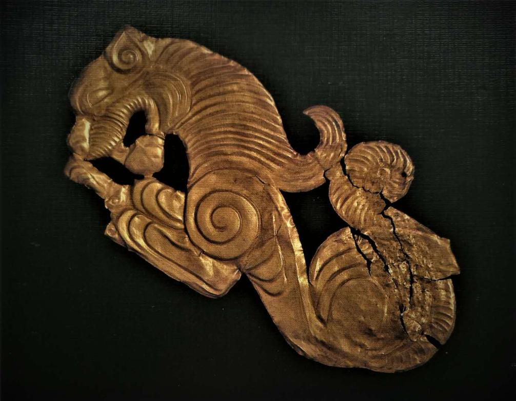 1976年—1978年修建南疆铁路阿拉沟段施工过程中,在阿拉沟东口、鱼儿沟车站地区,先后清理、发掘古代墓葬,其中四座竖穴木椁墓出土有大量黄金制品。发掘的沟口北岸墓地墓葬中,竖穴木椁墓的年代大致在战国至西汉早期。随葬品金器极为丰富,如:狮形金牌饰1件,虎纹圆金牌8块,对虎纹金箔带4件。此外,还有数量惊人的金饰、金箔等,轻薄如纸,总计达200多件金器,堪称“黄金大墓”。其中,虎纹圆金牌、狮形金牌饰、对虎纹金箔饰带的动物纹,与阿尔泰山北麓巴泽雷克战国时期墓葬出土动物纹风格相似。因此,阿拉沟木椁墓的狮子纹黄金饰件与古波斯艺术的狮子风格颇为接近。