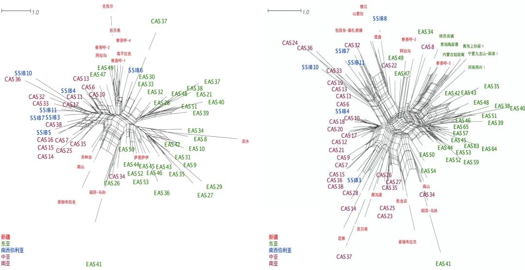 为了考察同一地区不同时期人群与周边人群随时间动态演变,我们使用系统发育网络分析、地理统计分析来考察以下两个问题:1.察吾呼墓地一期所代表人群在作为背景数据集的欧亚大陆公元前2000~前1000年的人群样本中的位置,以及察吾呼三个不同时期的样本与同时期其他人群的关系;2.察吾呼人群一期到二期、二期到三期人群的变化问题。