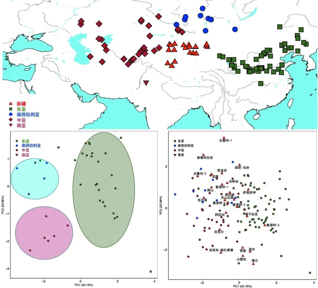 图1 样本地理位置和主成分分析结果[上图为样本集在欧亚大陆地图中的地理位置。下图左侧:作为背景样本集的公元前2000~前1000年的样本的主成分分析结果;下图右侧:公元前1000~公元500年的所有样本的主成分分析结果。每个颜色及形状代表一个的人群样本:新疆(红色三角形),东亚(深绿色正方形),西伯利亚南部(蓝色圆圈),中亚(棕色菱形),南亚(棕色倒三角形)]