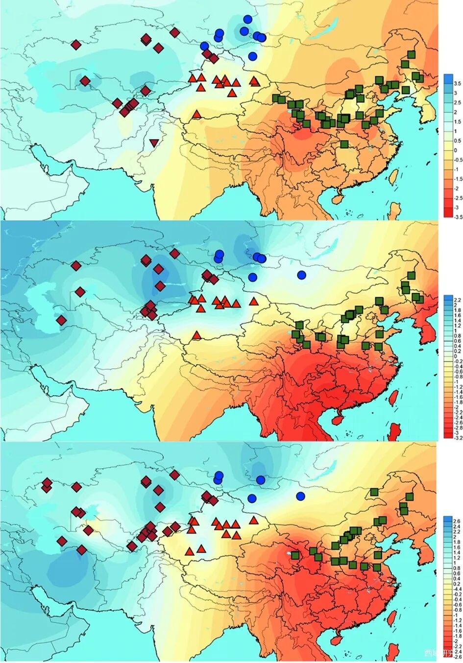 图3 基于克里金法生成的第一主成分地理等值线图(分组颜色标签与图1相同。底图上蓝色范围为西伯利亚南部、中亚、南亚类型的势力范围,黄色和橘红色为东亚人群的范围。上图为公元前2000~公元前400年的等值线图;中图为公元前800~公元前200年的等值线图;下图是公元前400~公元500年的等值线图。时间段有所交叠是出于在同样的时间框架及人群框架中观察察吾呼不同时期的样本的位置的需要)
