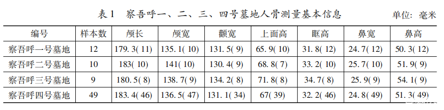 本研究共分析包括察吾呼一到四号墓地80例头骨在内的140个群体样本的颅面部测量数据。测量数据主要为韩康信和谭婧泽已发表及未发表数据(表1),虽然原始测量数据不包括察吾呼五号墓地,但与五号同时代同一文化特征的一号、四号墓地都在数据集中。此外,还加入新疆及欧亚大陆其他古代人群样本已发表的数据进行对比分析。[7]在主成分分析中,为了考察察吾呼人群与欧亚大陆古代人群的人群结构关系,我们选择比察吾呼人群年代更早的公元前2000~前1000年的样本作为背景数据集,进行主成分分析,然后将这一数据集的分析结果作为参考框架,将包括察吾呼人群在内的公元1000年以后的样本放入其中,观察不同时期内察吾呼人群在这一框架中的位置,从而在人群关系的动态结构中更清晰地考察察吾呼人群与更早期的人群的亲疏关系及变化情况。