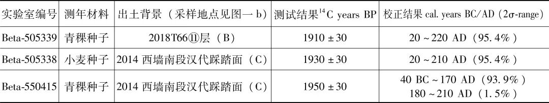 石城子遗址出土两份青稞和一份小麦种子样品的14C测年结果如表三所示,经树轮校正后,绝对年代范围分别是公元前40年至公元170年(2σ)、公元20~220(2σ)年和公元20~210年(2σ)。我们可以明确石城子遗址屯田农业活动的绝对年代处于西汉晚期至东汉时期。