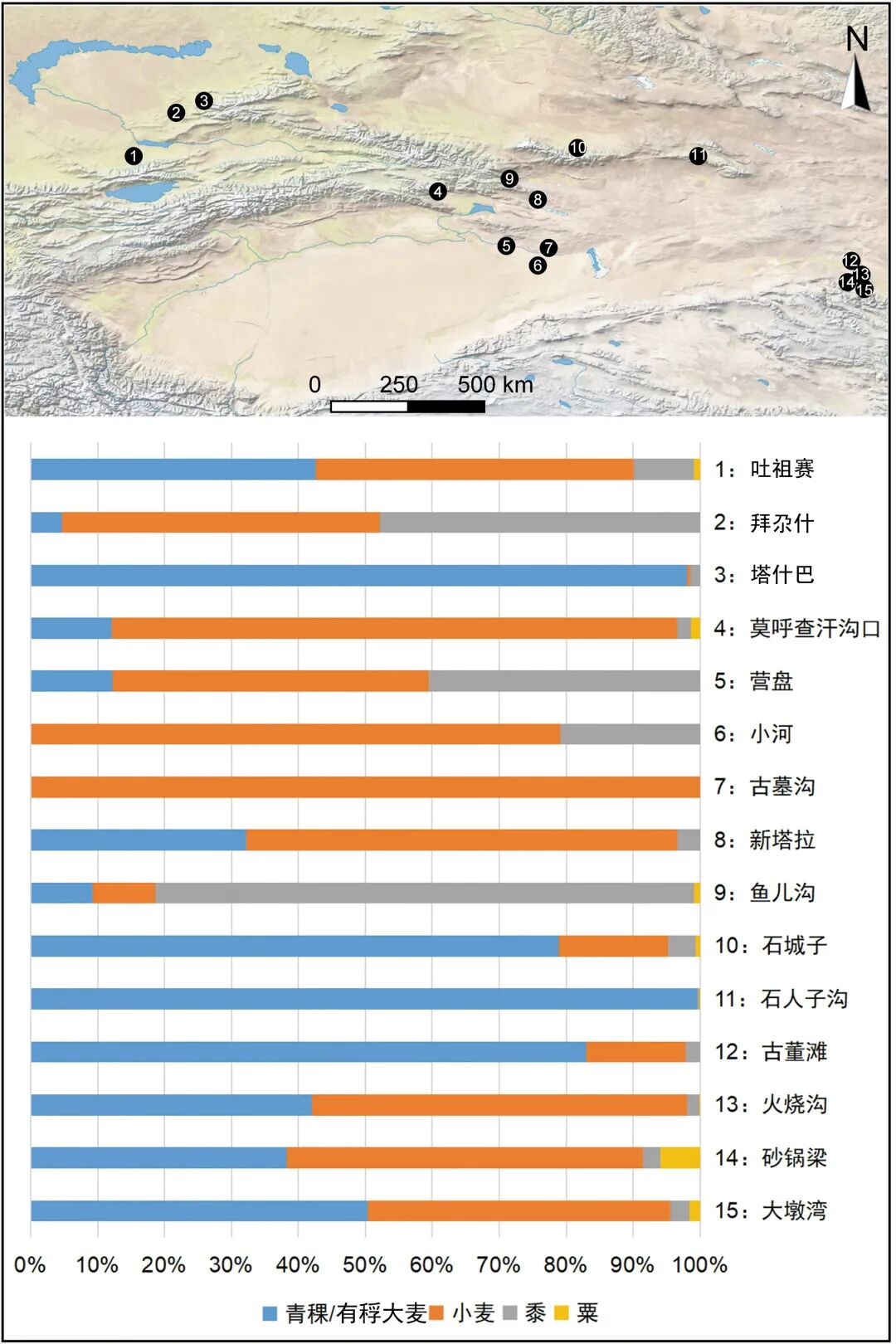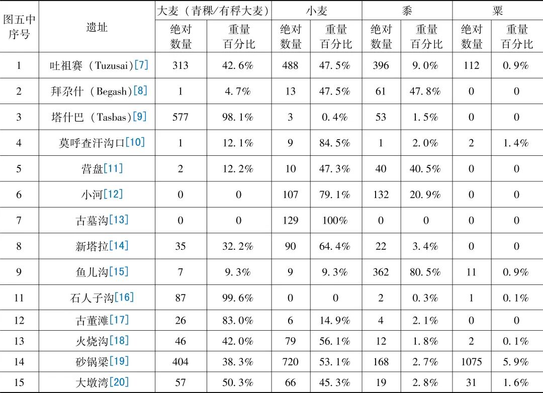第一类的遗址点为图五中5、6、7、9,主要位于塔里木盆地和吐鲁番盆地,这些遗址的作物组合中主要以小麦和黍为主,有少量青稞。第二类的遗址点为图五中4、8、12、13、14、15,主要位于焉耆盆地与河西走廊西部,这些遗址的作物组合主要以小麦和青稞/大麦为主,有很少量的粟或黍;需要指出的是古董滩遗址(图五:12)的作物组合与周边其他三处遗址(图五:13、14、15)相比明显不同,而与石城子遗址(图五:10)的情况比较接近。由于目前还未对古董滩遗址开展全面的植物考古研究,对古董滩遗址作物组合的特征及形成原因还有待于今后的深入探讨。第三类的遗址点为图五中10、11,位于东天山北麓,这些遗址作物组合中青稞占绝对重要的地位,有少量小麦,黍和粟的比重很低。第四类的遗址点为图五中1、2,位于天山山脉西部的中亚较低海拔地区,作物组合中常见小麦、黍和青稞。第五类的遗址点为图五中3,位于天山山脉西部的中亚较高海拔地区,作物组合以青稞为主,有少量黍。