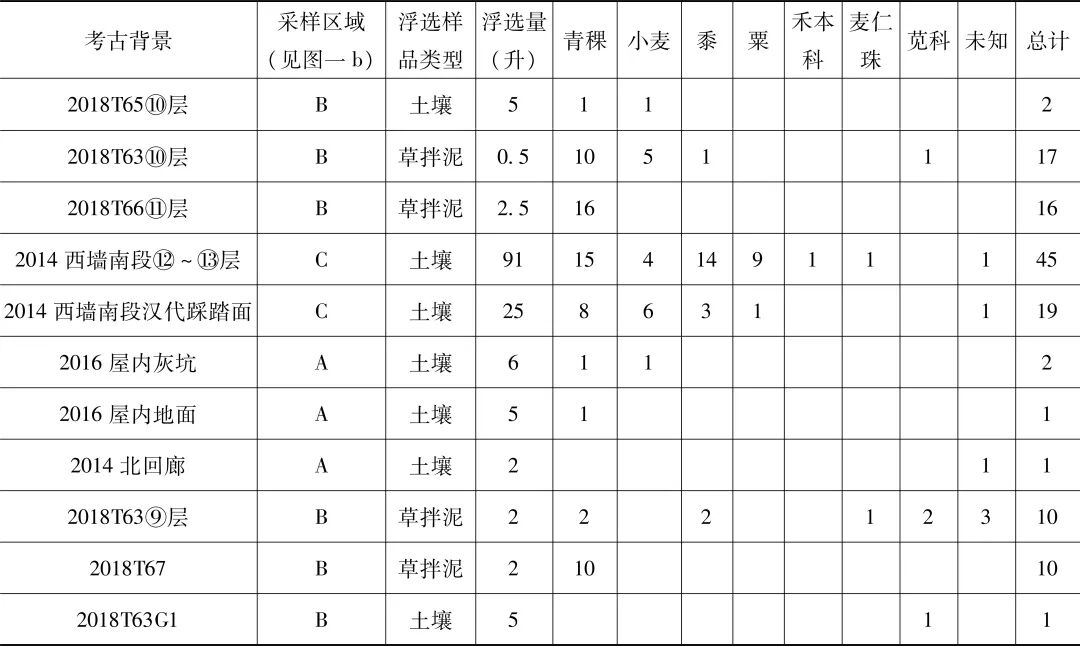 本文分析的炭化植物样品是在2018年石城子遗址田野考古发掘过程中通过水洗浮选法收集的。采样方法为针对性采样法,即以明确的汉代遗迹为主要的采样对象。除2018年的新发掘点外(见图一b:B),我们对之前发掘揭露的汉代房址(见图一b:A)和西墙南段汉代文化层也采集了浮选土样(见图一b:C),具体采样信息见表一。我们在遗址现场利用小水桶浮选法,对11份浮选样品进行了浮选工作。每份土样为0.5~91升,共计146升。浮选后所得轻、重浮物在当地阴干后,带回实验室进行分类、鉴定和量化分析。