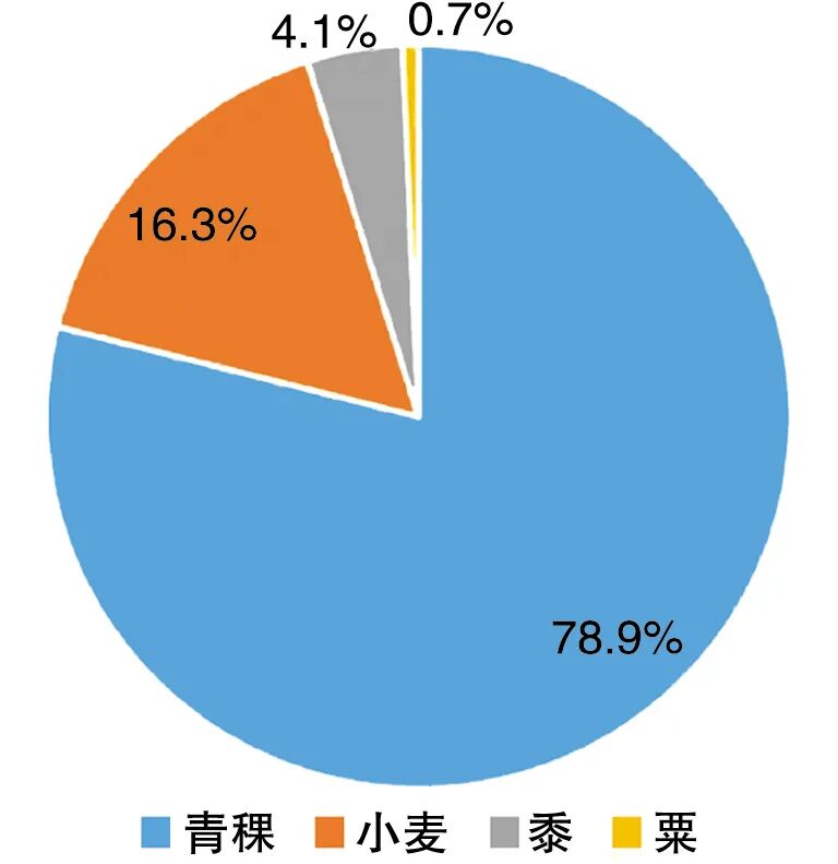 其中N1为出土黍的粒数,F1=7.5,为现代黍的平均千粒重;N2为出土粟的粒数,F2=2.6,为现代粟的平均千粒重;N3为出土小麦的粒数,F3=35,为现代小麦的平均千粒重;N4为出土青稞的粒数,F4=45,为现代青稞的平均千粒重,P(S)用来代表每种作物在总产量中的百分比。