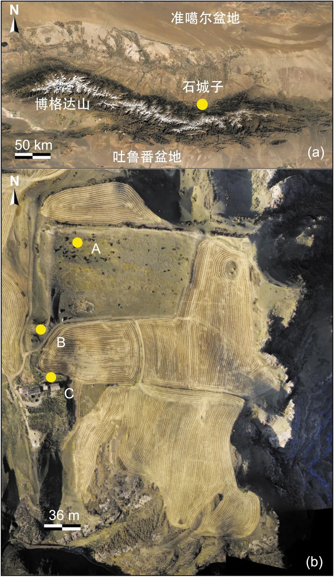 图一(a)石城子遗址位置示意图(黄点);(b)本研究采样地点(A,B,C)
