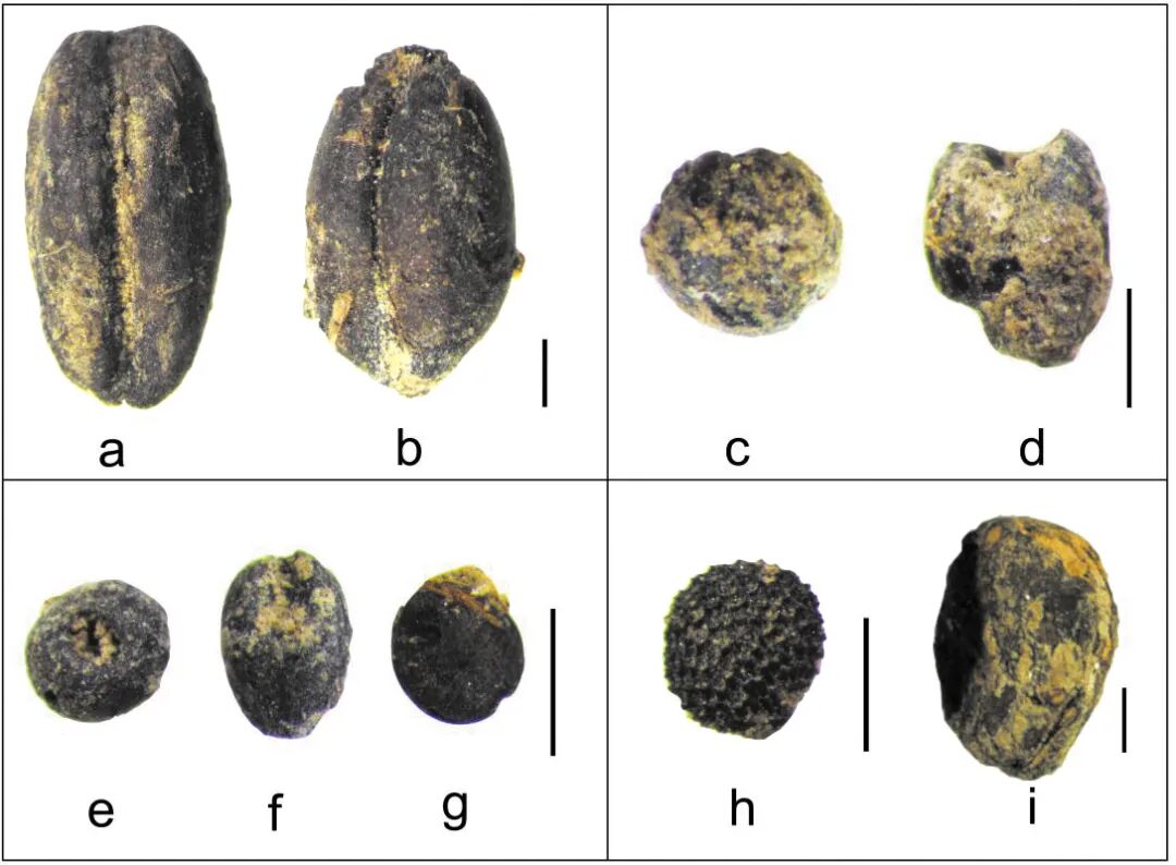 a)青稞(Hordeum vulgare var.Coeleste),b)小麦(Triticum aestivum),c)粟(Setaria italica),d)黍(Panicum miliaceum),e)麦仁珠(Galium cf.tricorne),f)禾本科(Poaceae),g)苋科(Amaranthaceae),h,i)未知。比例尺=1mm。