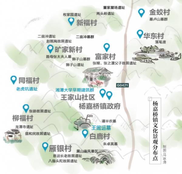 从市区出发,不到半小时车程,经过涟水桥,我们来到了湘潭县西部的杨嘉桥镇。这个总面积115.92平方公里的地方,交通便利,山水环绕。南部分列的虎行山、黑山、金盆岭三列小山脉为南岳余脉,形成丘陵山地地貌;北部涟水河畔形成冲积平原,地势南高北低。又长又直的列雁荆河流经此处,一路汇入涟水,两岸树木葱茏,风光甚好。涟水河一路奔腾,在即将投入湘江怀抱的时候,她回头亲吻了这片土地;当南岳的山势蜿蜒而至,在即将去往长沙地界的时候,她瞩目了这片原野。