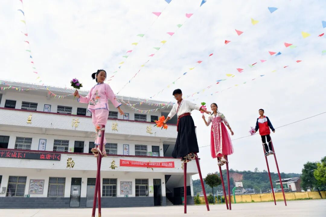看来,看似简单的高跷,要学会可没那么容易。而在虞唐镇当地,尤其是复兴村和虞唐村,踩高跷是一种代代相传的民间习俗,很多人自幼就会。“上世纪七八十年代,每到正月,复兴村和虞唐村村民还会相互比拼,街上热闹得不得了。”虞唐中心小学校长欧阳建回忆,那时候,村民们踩着高跷比高矮、比气势,节日的气氛在你来我往中更为浓烈了。周景祥还记得,中国取得抗战胜利时,虞唐人的喜悦之情高涨,一连踩了好几天高跷。如今,踩高跷的村民主要集中在学校所在的复兴村。