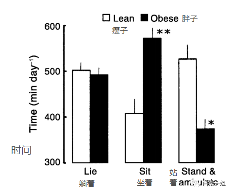研究人员在一个对比了10个轻微肥胖的人和10个瘦子的研究中发现,虽然都不咋运动,但轻微肥胖的人平均比瘦人每天多坐2小时,少站少走2.5小时。