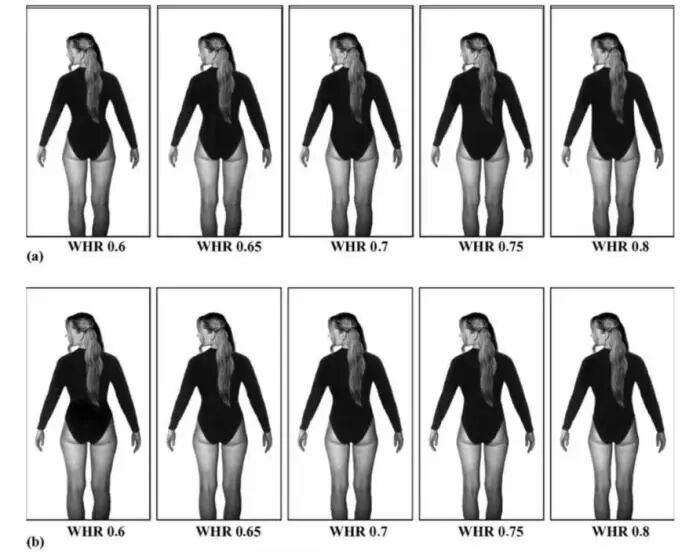 △图中第一排是臀的大小不变腰的大小改变后的腰臀比状态,第二排是腰的大小不变臀的大小改变后的状态。