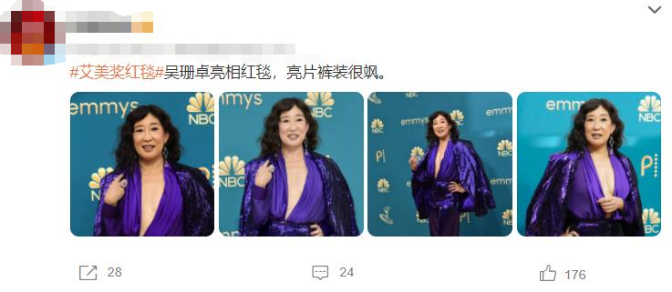 比如一身布灵布灵紫色亮片裤装深V出场的吴珊卓,一亮相就分外的抢镜