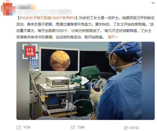 下面这个姐妹更离谱,坚持每天跳绳1000个,最后不仅把自己跳骨折还成功的上了热搜