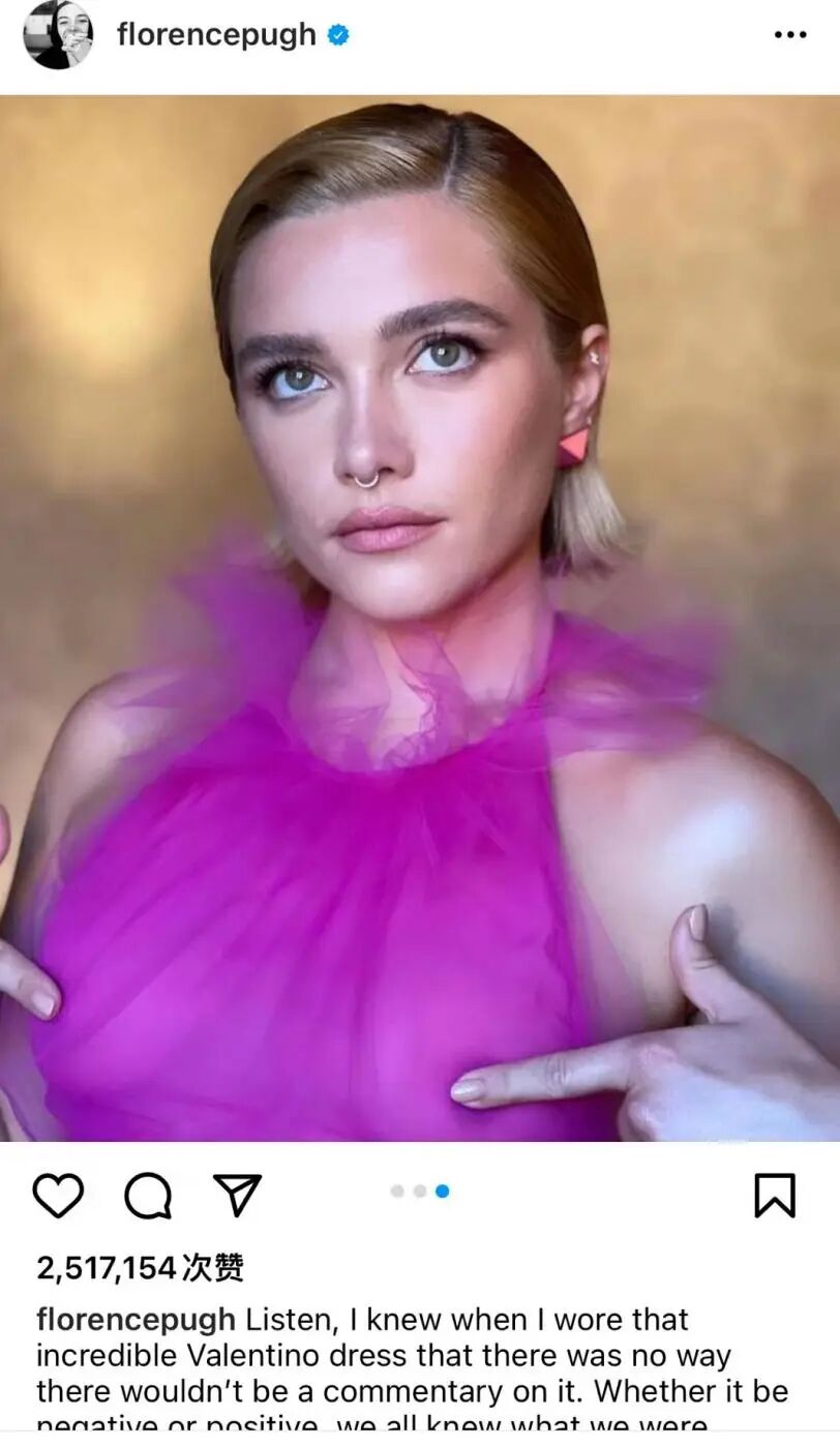 总的来说这些负面的声音无外乎是因为Pugh没有穿胸罩、没有贴胸贴,但选择了一条自己喜欢的透视礼服。