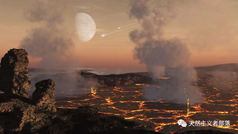 艺术家对冥界地球的印象。巨大的、撞击产生的熔岩湖与地表液态水共存,在由熔岩释气维持的厚厚的温室大气中。图片来源:SwRI/Simone Marchi,Dan Durda