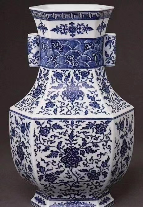 清乾隆 青花缠枝花卉纹双耳六方瓶