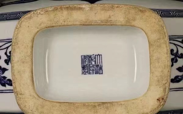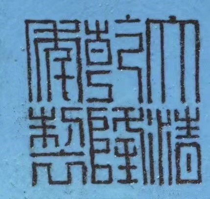 青花篆书款笔画平直,横竖粗细一致,转角熟练,不留停落痕迹。