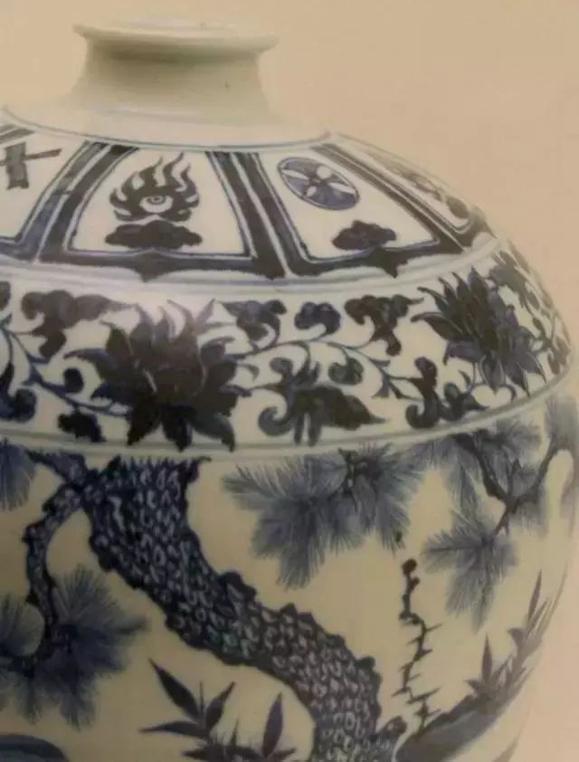 《中国陶瓷史》(中国硅酸盐学会,文物出版社2006年印刷)介绍,青花色泽的浓艳,是永乐、宣德时期最主要的共同特征。这时期所用的青料是“苏麻离青”,这种青料含锰较低,含铁量较高。由于含锰低,就可以减少青色中的紫、红色调,在适当的火候下,能烧成像宝石蓝一样的鲜艳色泽。但由于含铁量高,往往会在青花部分出现黑疵斑点。这种自然形成的黑斑,和浓艳的青蓝色却又相映成趣,被视为无法模仿的永、宣青花瓷器的“成功之作”。