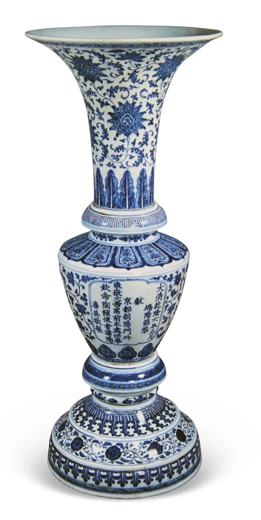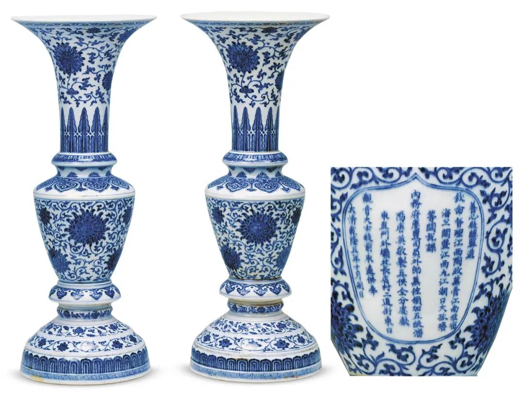 而见于北京翰海艺术品拍卖公司1996 年春季拍卖会上的一件乾隆六年唐英制青花缠枝莲纹花觚),高 65 厘米,腹部如意头形开光内自右向左排列竖写七行青花楷体供养铭文。即:“大清乾隆六年五月端阳节,恭献京都朝阳门外东岳大帝案前永远供奉,钦命陶榷使者沈阳唐英敬制。”
