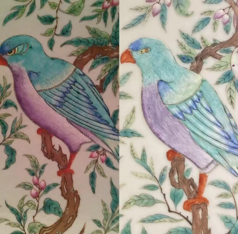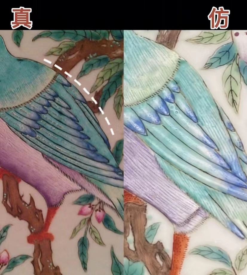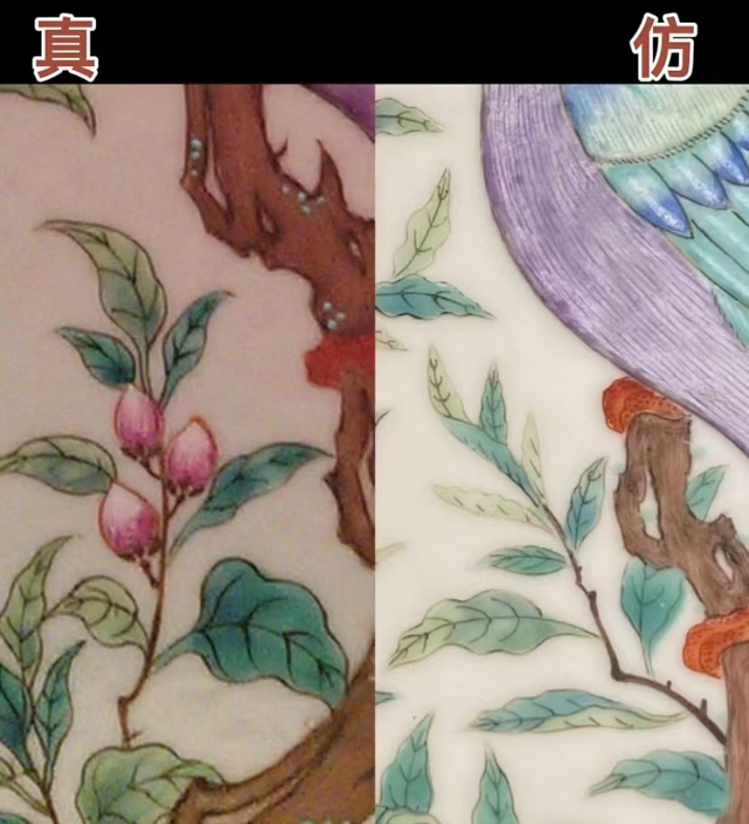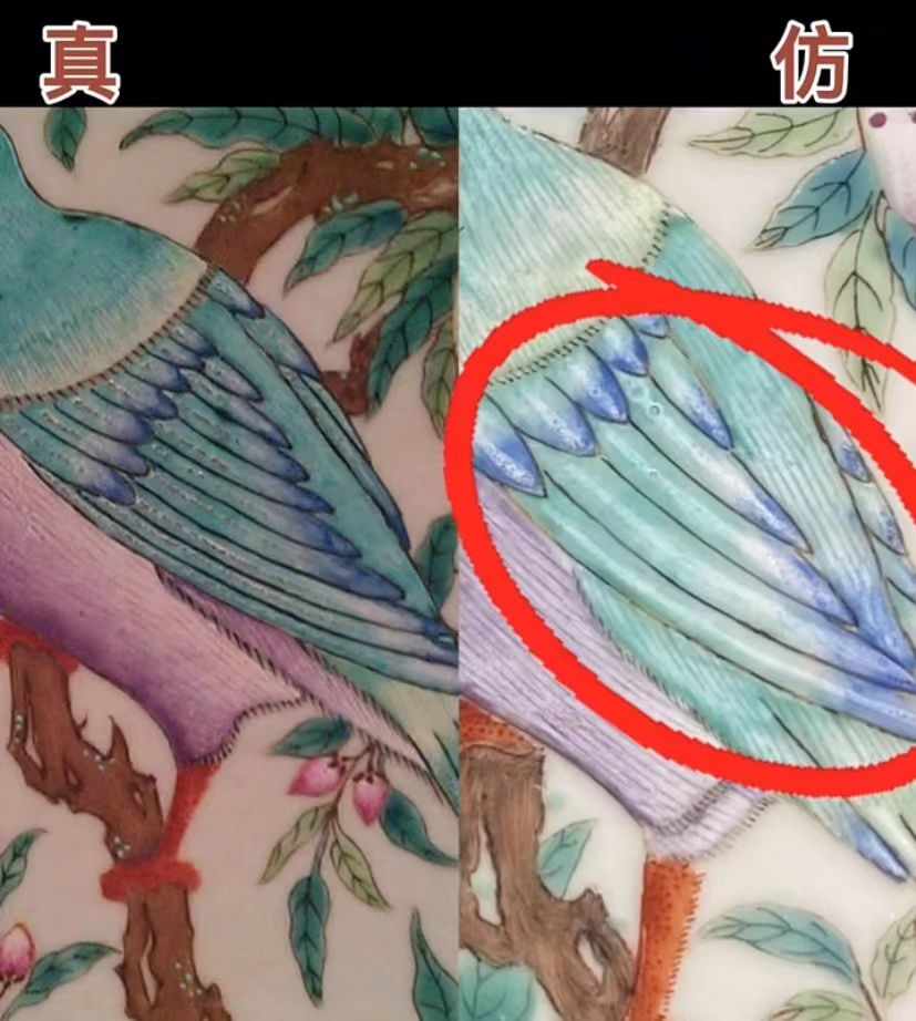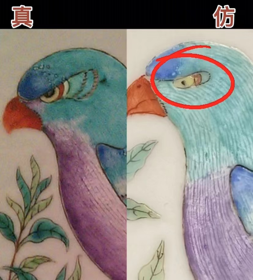 其次,我们再看鹦鹉的羽毛,真品多达十几层,而仿品只有四五层,那么这个明显就属于偷工减料,因为仿的人他画工水平不够,你让他画很多,他容易漏出马脚,他只能在自己绘画水平的安全范围内,画出这些东西,一旦让他画很多,他很可能就画歪了,或者画的不像了,他水平有限只能画这么多层。