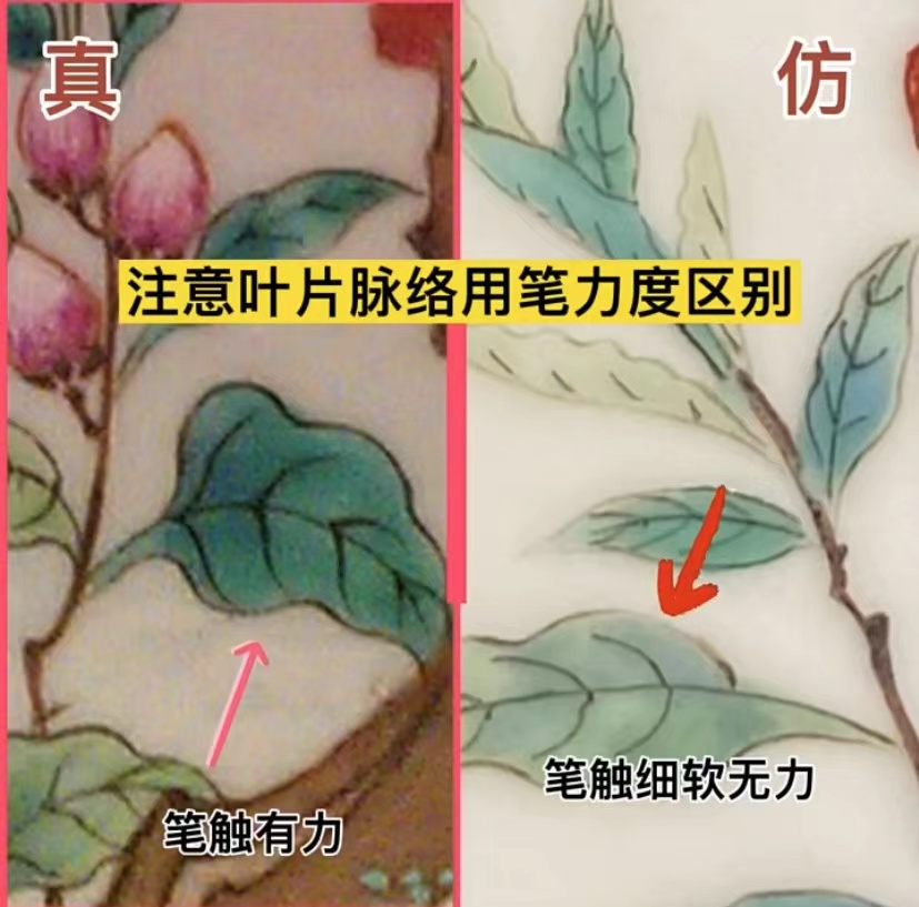 最后,我们来看鸟爪子树枝旁边的叶子,真品非常灵动,叶子蓝绿颜色结合,叶片的这种轮廓,舒展状非常好,有一种像水波的感觉。仿品,叶子看起来很轻浮,跟真品对比叶子是平趴在这个地方的,很平面化,一点都没有扭动感,即使他画出了一些扭曲的线条但是没有扭曲的灵动感。