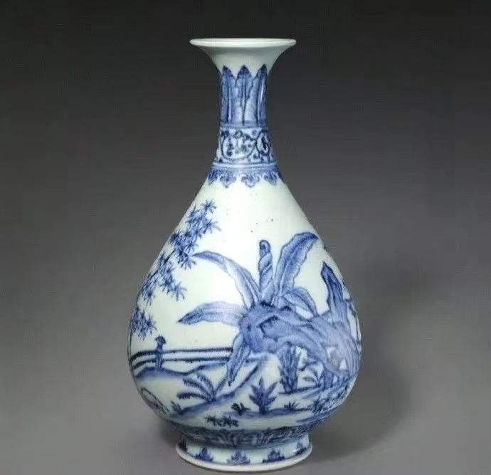 发展到明中期以后,玉壶春瓶的造型又趋于细腻圆润,优美流畅。在釉彩与纹饰上,明代的玉壶春瓶又以青花品种最为常见,主题纹饰常常以云龙、梅、兰、花鸟、缠枝莲等为主要图案。但总体言之,明之玉壶春瓶,不复有宋元两朝之韵。
