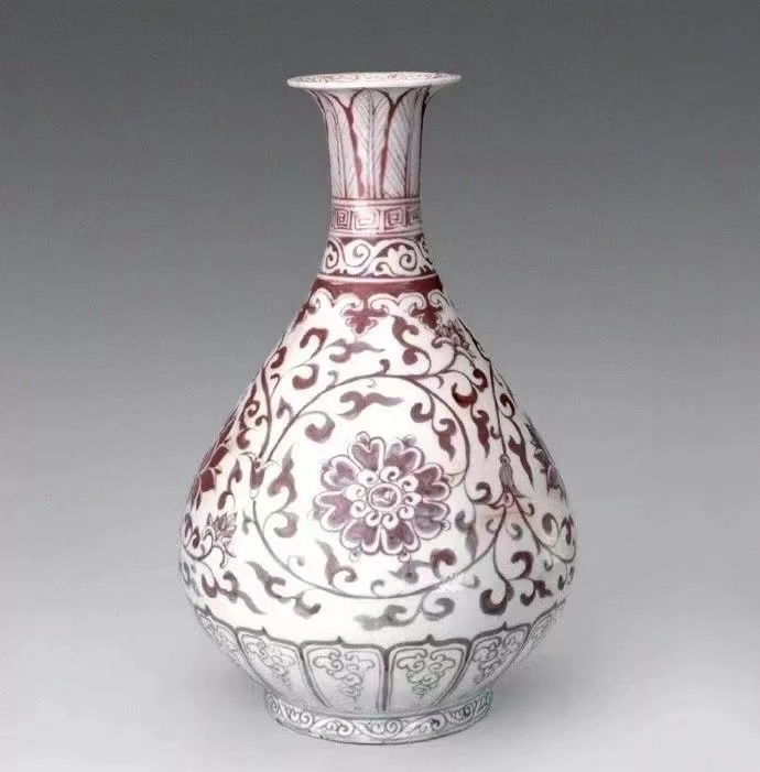 2006年,香港佳士得春季大拍,赌场大亨史提芬永利(SteveWynn)投得一件明洪武釉里红缠枝牡丹纹玉壶春瓶,其造型、纹饰及尺寸与景德镇出土的一件经典之作雷同,当时上拍便创下成交价最高明初瓷器世界记录;