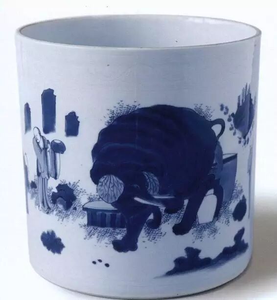 具备这些特征并带有纪年的器物,制作于1634-1643年间。笔筒器身所绘为大象洗浴的仪式称为“扫象”,