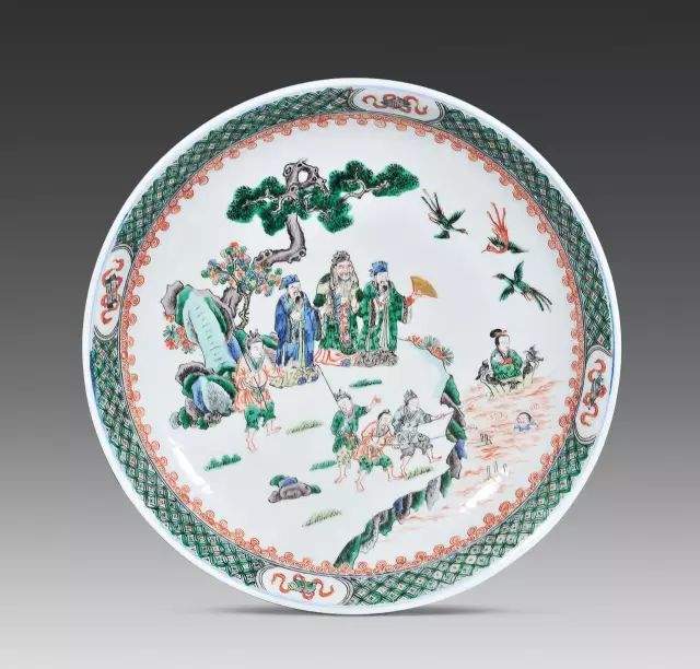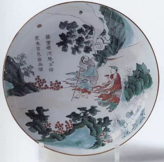 碟内以红彩,两种不同色调的绿彩,以及黑彩描绘了八仙中的铁拐李和蓝彩和。