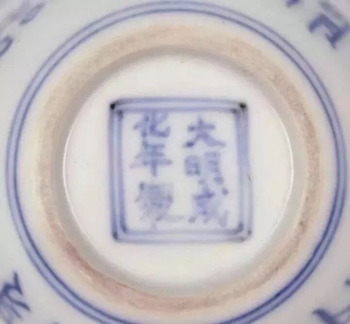 明代瓷器的款识形式一般以书写为主,极少有刻印的。宣德民窑器仍有一些草书或隶书的福、寿字,也是多写于器心。还有写“大明宣德年造”的,十分特别。此外,从花纹、文字上看,伪制的花纹、文字一般都有不太周到的地方,花纹线条、文字笔划或者残缺,或者粗细不一样。有的赝品图纹甚至于显得僵硬呆滞,一望而知系临摹作品。