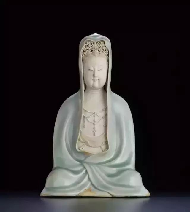 青白釉袈裟自头顶披下,袒露出素白面部及前胸。胸前佩璎珞及丝带,塑造精細。此尊观音胎质坚致,洁白细腻,容貌圆润慈祥,秀丽柔美,为难得、珍罕的艺术精品。