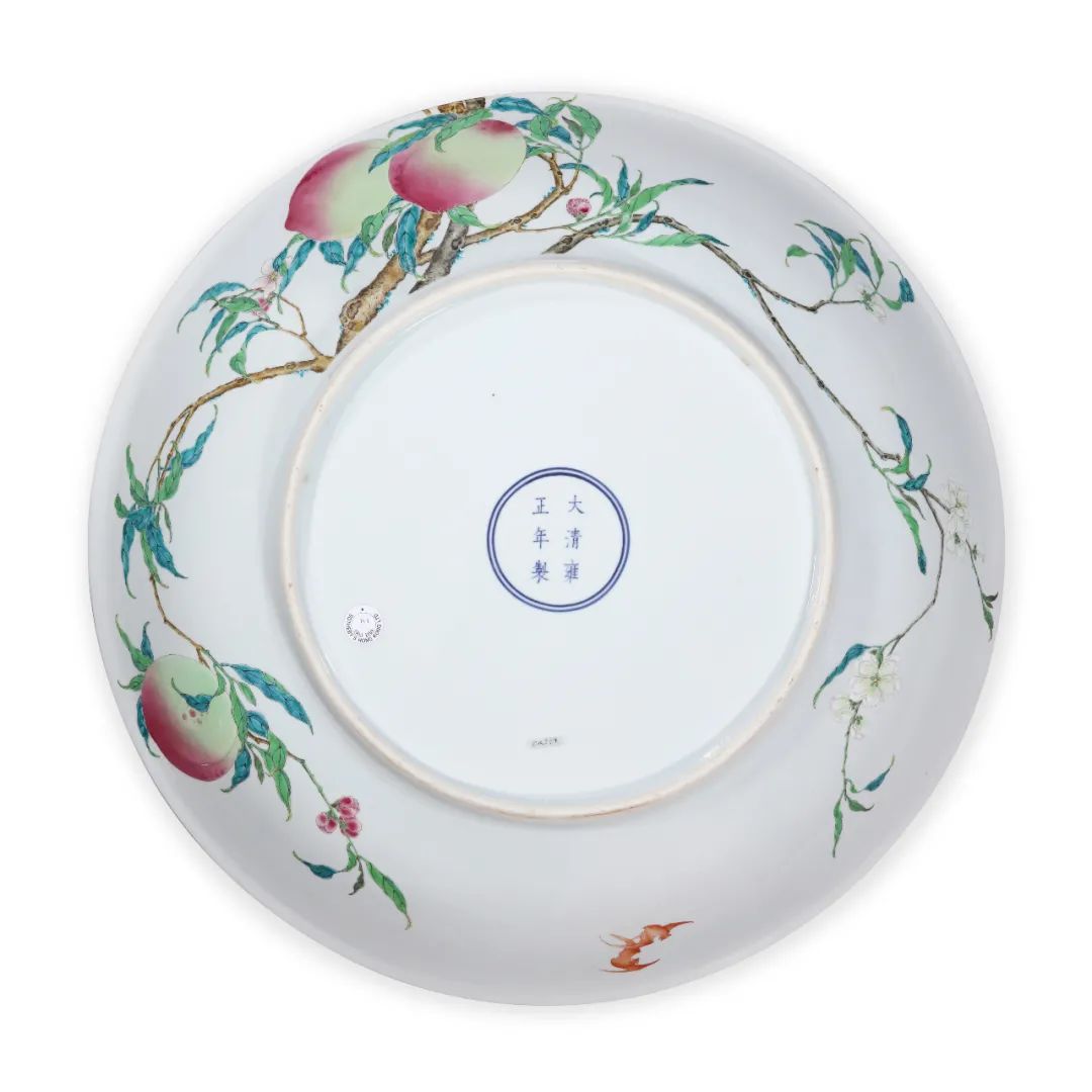 雍正御瓷的桃蝠纹,描绘入微,饱满莹润,枝叶繁茂,经脉毕现,祥蝠姿态各异,生动可爱,因此虽不常见,仍广为人之。与本器相仿之品,虽然屡见于册,却如凤毛麟角,极为罕见。盘之纹样画工新颖别致、细腻典雅,施彩技术亦妙至毫巅。每朵桃花均用极细的深色线勾勒轮廓,既层次分明,又无损花瓣之娇美。花瓣本身的颜色粉中泛黄,向花芯处的渐变深浅有致,纤细的花蕊用蛋黄料彩厚涂而成,甚具三维效果。颇堪玩味的是,桃枝上的青苔,均是直接在绘好的粉彩地上画成,看来更为逼真写实。盘身绘五红蝠,常见于中国工艺,红蝠意指洪福齐天,五蝠音同五福,高寿、康宁、富贵、好德、善终。此类典故颇得雍正之意,可见其授命画制的《胤禛行乐图》册页,〈仙桃戏猴〉一景描绘其喜得蟠桃,身旁树上伴有灵猴。同册另一景,绘其观澜之姿,一蝠于上盘旋。雍正一朝作桃纹于各式器物,然新创粉彩瓷的多样色调,粉红、淡黄、浅绿等,最能贴切表现桃实枝叶。雍正一朝,世宗为证继位正统,笃信祯符,复兴祥瑞饰纹。世宗也重启赐赏如意之习,并时命画师绘其像,画中置身祥纹瑞饰之间。