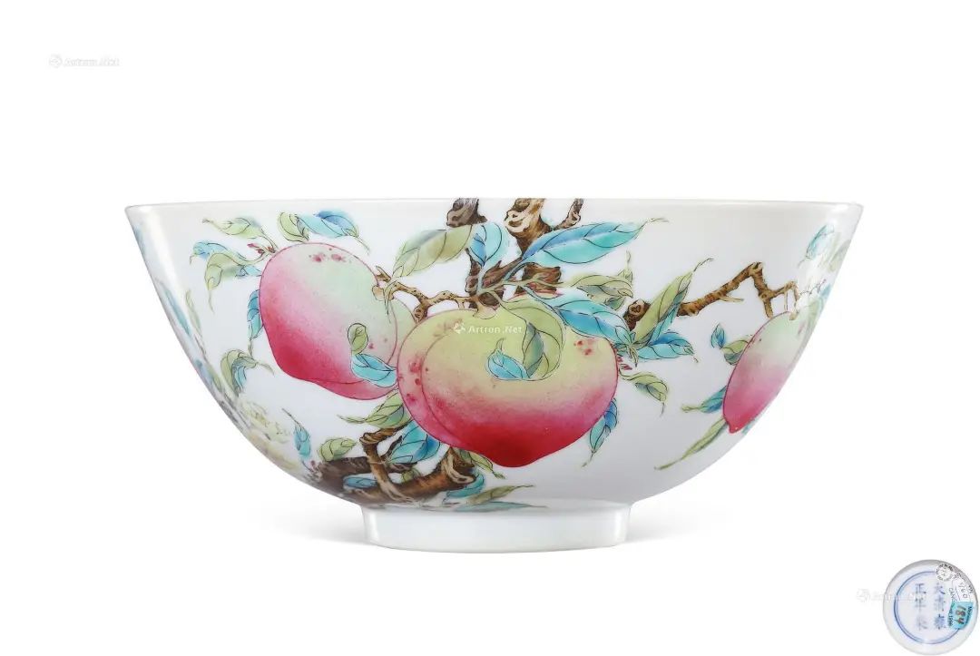 「过墙枝」,音谐「长治」,借喻政通人和、长治久安。故此,当中既有歌功颂德之心,八桃五蝠,取「洪福齐天」、「福寿双全」之意,此类雍正御瓷在处理此种高难度题材时,亦应为雍正皇帝亲谕,或以宫廷画师为摹本而来,处处匠心独运,笔笔浑然天成。