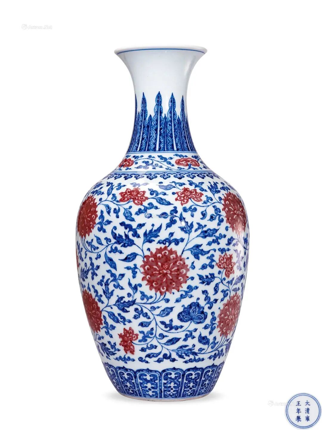 清雍正青花缠枝莲釉里红灵芝石榴花纹观音尊出自英国温彻斯特贵族私人收藏,蓝红两色绚烂无匹,反映雍正时期制瓷技术炉火纯青的高超水平。