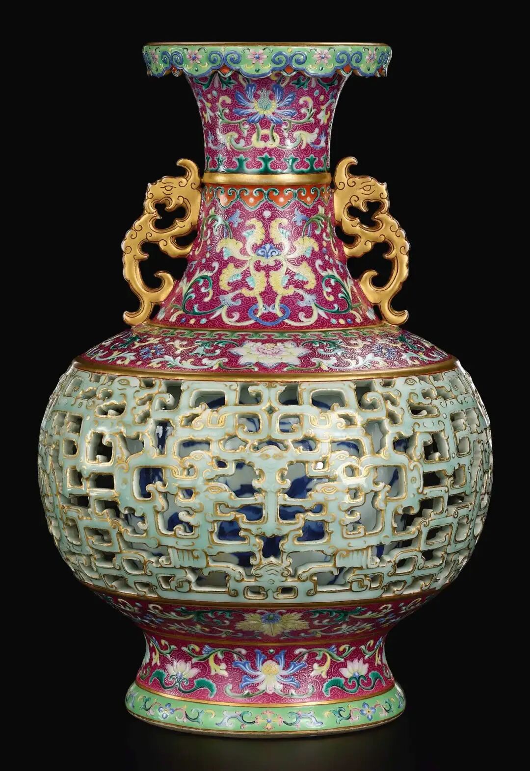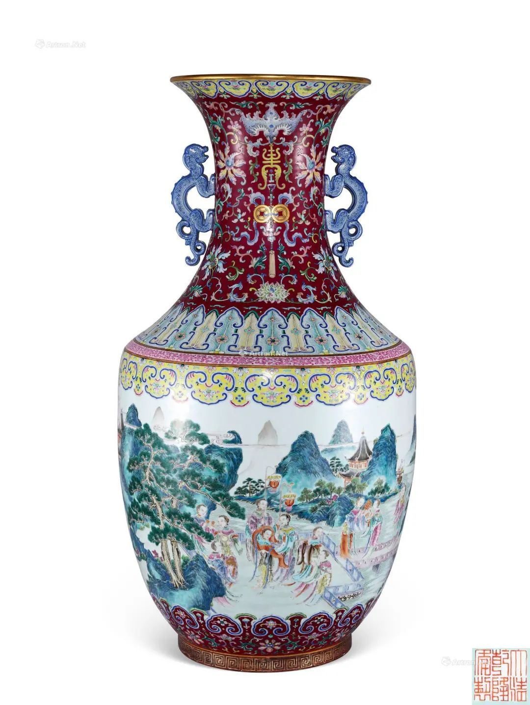清乾隆洋彩胭脂紫地描金开光通景“歌舞升平 福在眼前”图双螭耳大瓶为其中重器,曾著录于著名西方陶瓷藏家霍布森出版之《中国陶瓷》一书。与台北故宫博物院馆藏的两件乾隆粉彩仕女乐舞灯笼瓶所绘场景及装饰风格颇为相近。此器所绘之蝠、寿及舞乐场景,既是对太平盛世之描摹与颂赞,对帝王与万民同寿之恳切心愿,更寄托着十全老人对子孙江山万年之企盼。