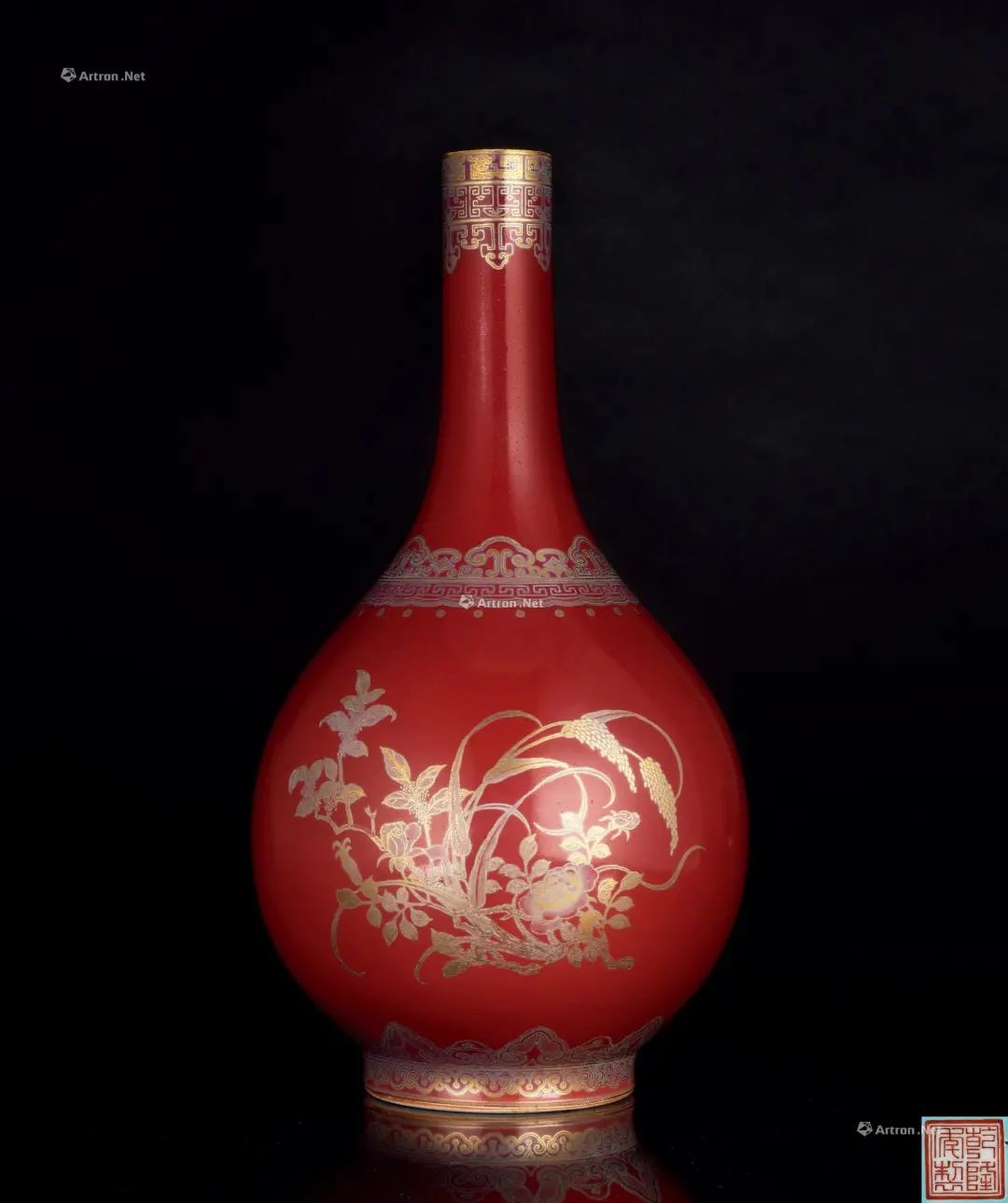 此器底部所书双框四字篆书方款,书写规整而不失书意,极为少见,仅在品级极高的器物上偶见一二。相似写法多见蓝料彩书就,如故宫博物院藏黄地开光题诗山水人物图方茶壶,见《故宫博物院藏御制诗陶瓷器》,北京,2016年,图版81,其绘工颇具洋彩风格。台北故宫博物院藏几件珐琅彩及洋彩器上,亦见写法微异之四字篆款,如《华丽彩瓷 乾隆洋瓷》,台北,2011年,图版4、38、42。社稷永固 四时长春瓶小口直颈,溜肩鼓腹,下腹部内敛,圈足;周身施匀润霁红釉,足内以矾红彩书「乾隆年制」四字双框篆书款,余处施松石绿釉。整器以金彩装饰,口部、颈部及近足处分别绘夔龙纹、变形蕉叶纹、如意云头纹等;瓶身主体一面以金彩绘月季、谷穗、桂花等祥瑞花卉植株,另一面书乾隆御题诗。乾隆皇帝曾在《咏瓷挂瓶》一诗中赞曰,「胆瓶、纸槌瓶,皆瓶式最佳者」。此瓶形似垂胆,规整端秀,当属「最佳」瓶式,定颇得帝王喜爱。桂花点点,芬芳馥郁,满城飘香。其寓意典出《晋书·郄诜传》:郄诜为雍州刺史,赴任前,武帝问他的自我评价,郄诜答道,「臣举贤良对策,为天下第一,犹桂林之一枝,昆仑之片玉」。桂枝用以比喻杰出良才,并将折桂引申为登科夺冠之意。再者,乾隆生日为八月十叁,而八月正是桂花飘香的季节,故宫博物院藏有一幅乾隆初期的肖像画《高宗观月图》,画中的乾隆皇帝面容轻消,蓄有小髭,正翘脚抬首,悠闲地坐于桂花树下品茗观月。图中圆月当空,桂花点点,所描绘的正是乾隆皇帝生辰万寿节前后的图景,因此桂花图案于乾隆应也多了一层特别的含义。