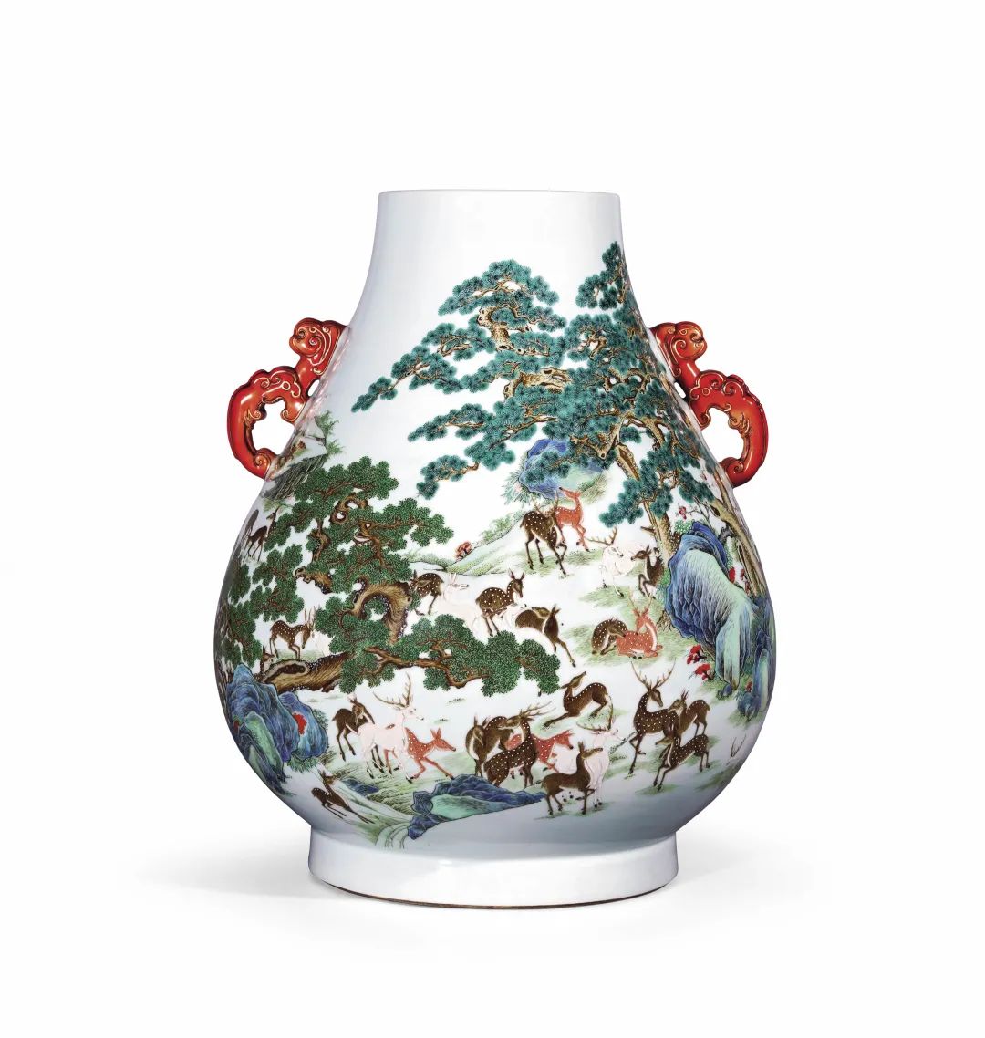 拍品敞口,口下渐广,垂腹,圈足。拍品造型沉稳庄重,胎质坚实细润,通体施白釉,施釉丰满,釉汁丰腴莹润,釉色微闪淡青。肩两侧对称饰矾红描金螭龙耳。器身以粉彩绘山水园苑百鹿图,但见隔岸地势起伏,植被繁茂,梅花鹿叁五成群,或奔跑,或憩息,或相偎,姿态各异,但描绘简略,突出远景之比对。近景处则描绘详实,寿石相迭,有嶙峋峥嵘之貌,其侧两株苍松相依傍,枝干遒劲,松盖如伞,夹岸处有溪流跌宕而下,松荫之下几只梅花鹿徜徉其间,与常见百鹿尊鹿纹描绘较为简略不同,本品之鹿纹颇具西洋画法,鹿毛的质感通过明暗之对比,色彩的交错得以精细的表现,百态悉备,生动而传神,而山石苍松之画法则更多的遵循中国传统山水画之笔意,二者交融于此方天地,可谓中西合璧之佳器。鹿与“禄”谐音,百鹿即“百禄”,取高官厚禄意。故此器又名“百禄”尊。鹿为仙禽,与瑞草灵芝、桃、松桐象征长生不老、松鹤延年之意愿。此尊画面表现了清皇朝重要的狩猎活动木兰秋狝。木兰为满语,意为“哨鹿”,秋狝指秋天打猎。这是自康熙二十二年起几乎每年秋天都举办的大典,这并非为了狩猎娱乐,而是具有重大的政治、军事意义。康熙皇帝为锻炼军队,在承德以北开辟狩猎场,每年秋季狩猎时用八旗兵头戴鹿头,在树林里口学鹿啼叫,引诱异性,鹿出之则合围猎杀。乾隆皇帝对此祖制甚为重视,还命宫廷画师把实况记录下来,景德镇工匠就照着这些画卷,把此重要的活动重现于百鹿尊,也是帝王铭德之器。无耳百鹿尊,现仅知一例,该例现藏东京静嘉堂文库美术馆。百鹿尊更多缀以矾红彩耳,本品即为一例。上海博物馆收藏一例,器形纹饰相近,载于《中国陶瓷全集》,卷 15,图版17。清宫旧藏另见一尊,现藏于北京故宫博物院,录于《故宫博物院藏文物珍品大系·珐琅彩、粉彩》,图版 85。