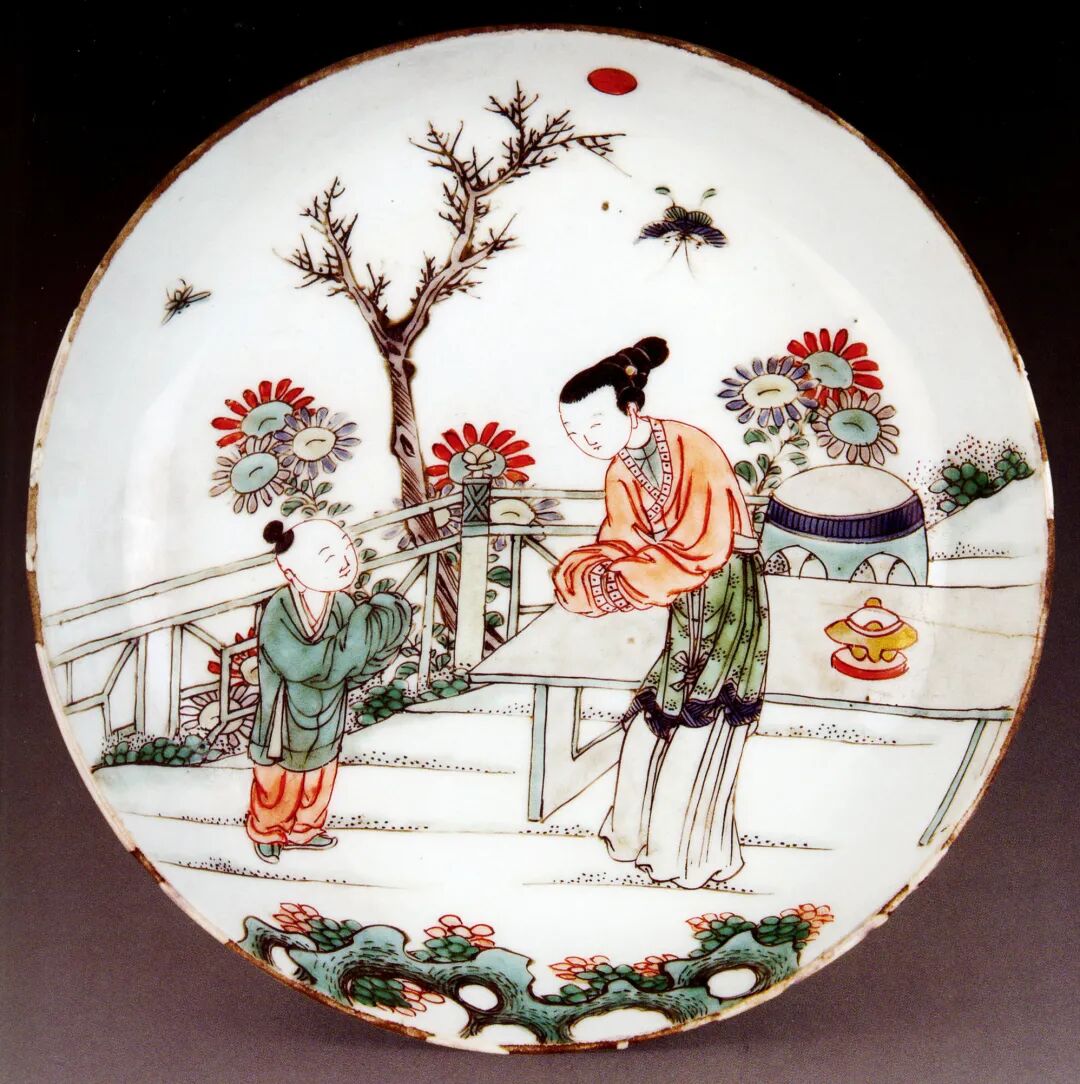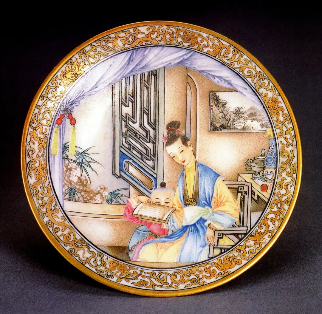 清代瓷器上流行的仕女婴戏题材中便有很多这方面的图像。如现藏于台湾国立故宫博物院的一件清代乾隆红地珐琅彩碟上的课子习书图:窗外翠竹横斜,室内典雅舒适,一位娴淑端庄的母亲端坐于椅子上,正向依偎在身旁的孩童指导书上的内容。室内陈设讲究,墙上挂着名人山水画,案上摆放着青铜器等古董,衬托出官宦世家的富贵之气,也象征着母亲的学识与修养。