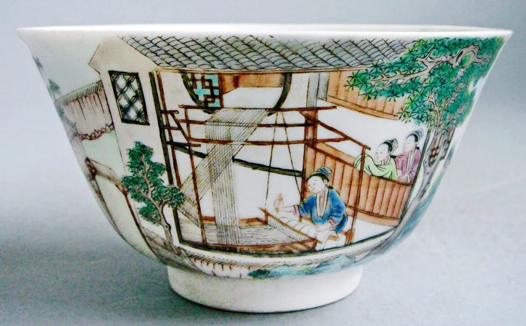现藏于北京艺术博物馆的这件清代道光粉彩碗上的织布图:宽敞明亮的室内,摆放着一架高大的织机。一蓝衣女子右手拿梭,正坐在织机前愉悦地织造。窗外的红衣女子与绿衣女子正在观看。画面写实,是当时民间手工织造场景的真实记录。