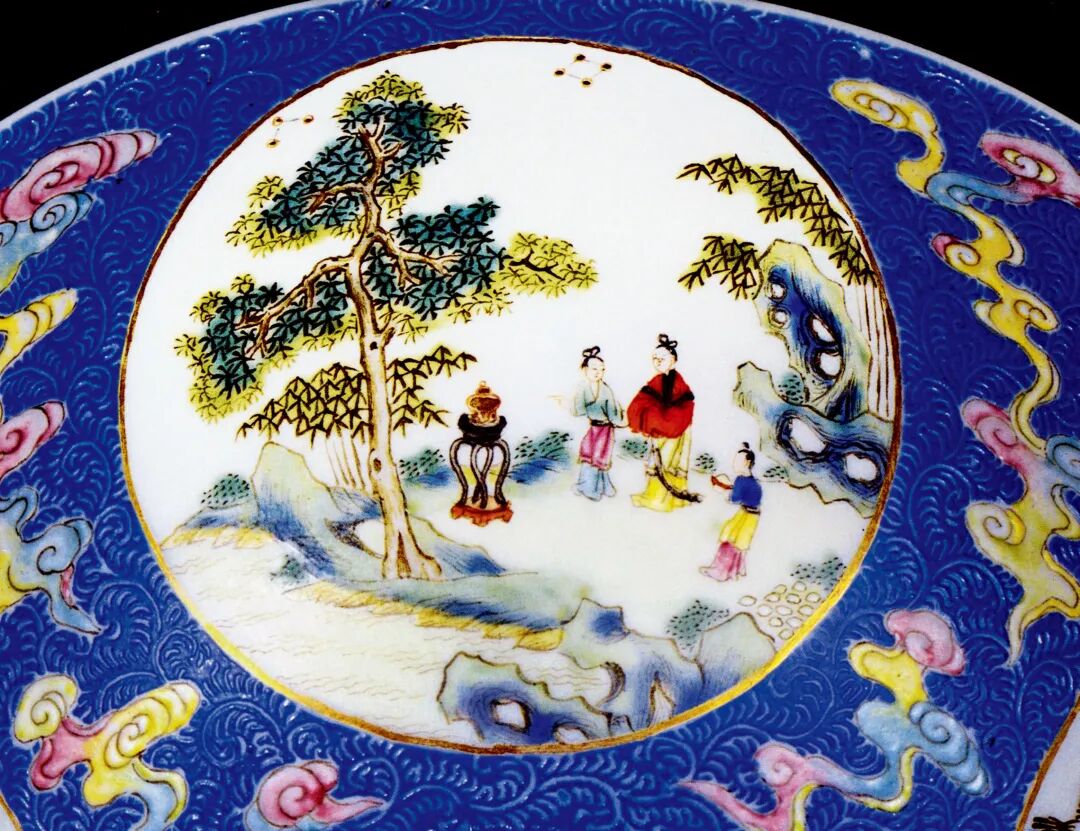 盘里面以青花绘一位仕女,她右手展扇,扇面上精妙的文人山水图衬托其深厚的艺术修养与高雅的生活格调。