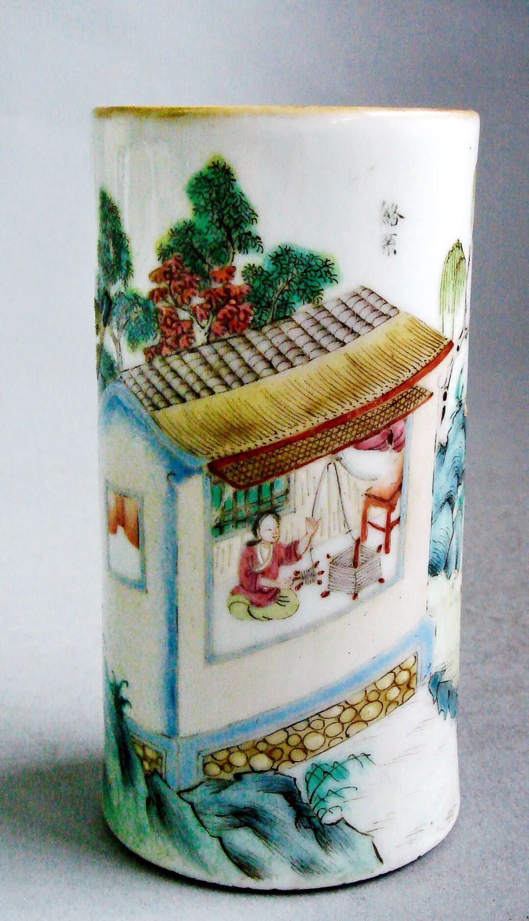 女红是清代女性必修的日常家务劳动内容,也是生活的技能与品行贤淑的衡量标准之一。如现藏于北京艺术博物馆的这件清代道光粉彩笔筒上的络丝图:简陋的室内有一名女子右手拿丝篗,正坐在一架络车前娴熟地操作。空白处书写“络系”二字,点明了画面主题。图像为实场描绘,因此具有珍贵的资料研究价值。