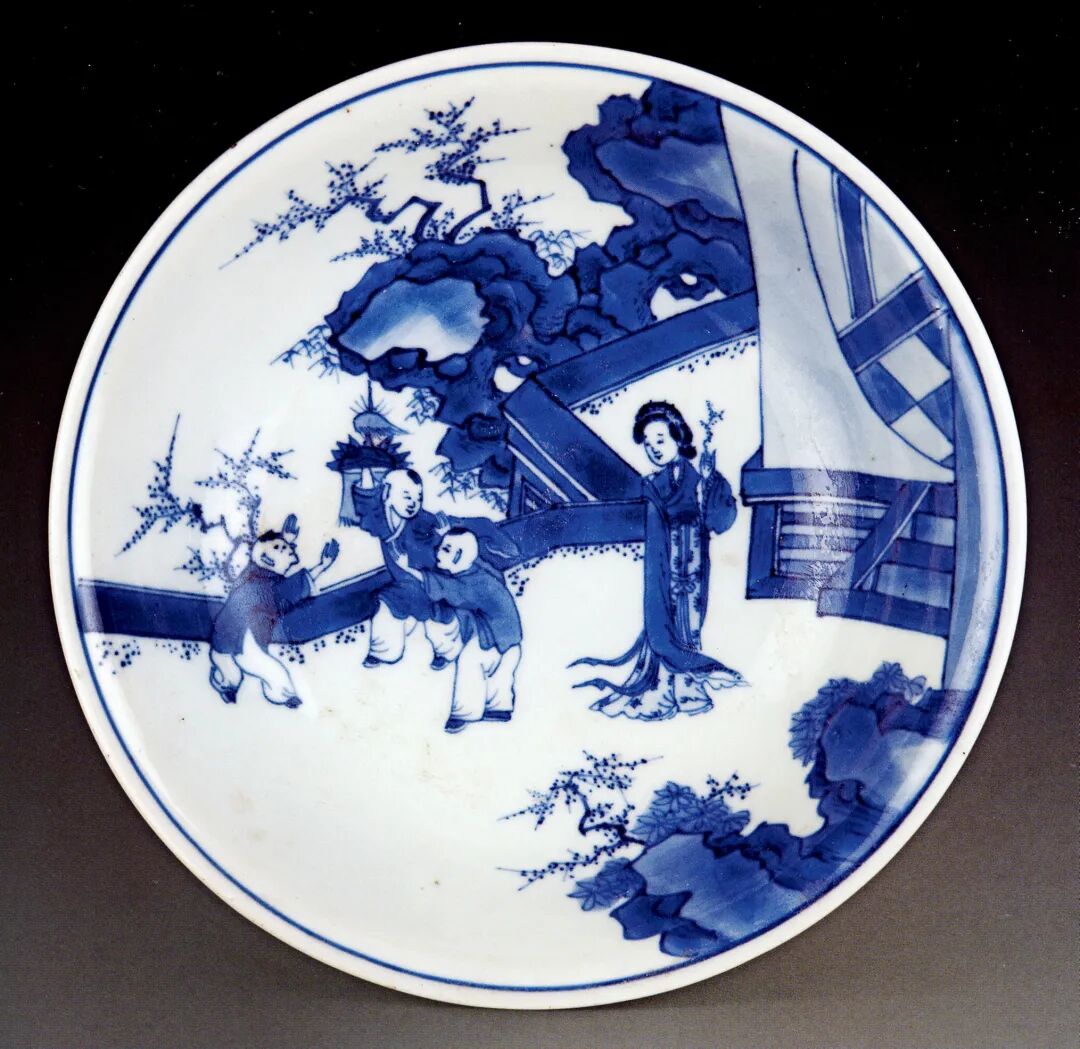 清代人们大多是通过读书识字、高中状元、进入仕途而改变命运的。受此儒家思想影响,瓷器上出现了许多寄托愿望的象征性装饰符号与图像。藏于故宫博物院的这件清代康熙青花盘上的仕女婴戏图:在高墙围护、洞石玲珑、亭阁错落、桂花盛开的庭院里,一位母亲手擎桂枝,侧身回望着三个争夺官帽的孩童,寓意“折桂加官”、“夺冠登科”。