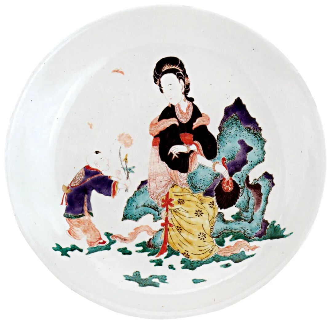 这些画面以母亲与孩童为核心,其中童子戏莲、赏莲图寄予了人们对多子多福、连生贵子的期待。如现藏于上海博物馆的这件清代康熙五彩盘上的仕女婴戏图:一位手持羽扇、端坐玲珑石上的母亲,正扭头注视着一手持荷花奔跑而来的孩童。孩童胸佩金锁片,衣饰华丽,表情活泼。母亲装束高贵,面带微笑,慈爱静雅。孩童手举莲花,寓意“连生贵子”。